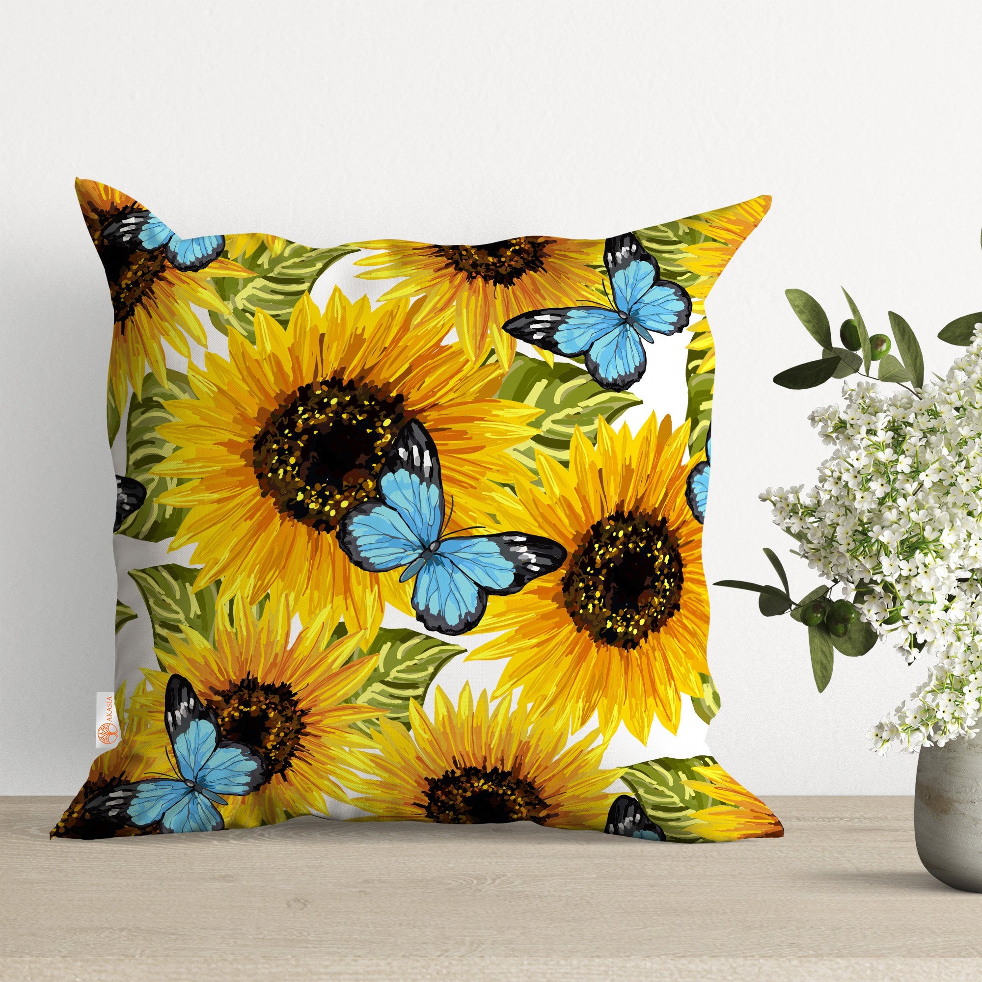 These elegant square decorative farmhouse throw pillow covers with Sunflower and Butterfly prints;