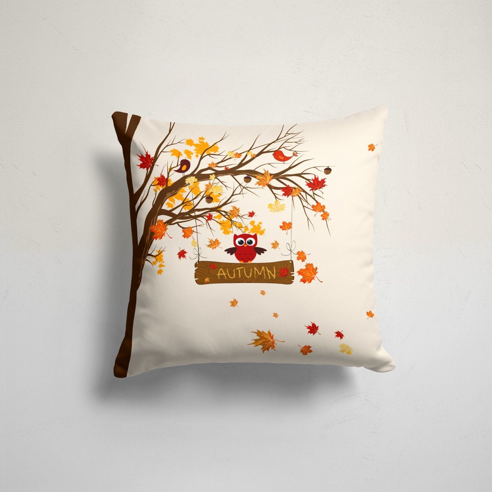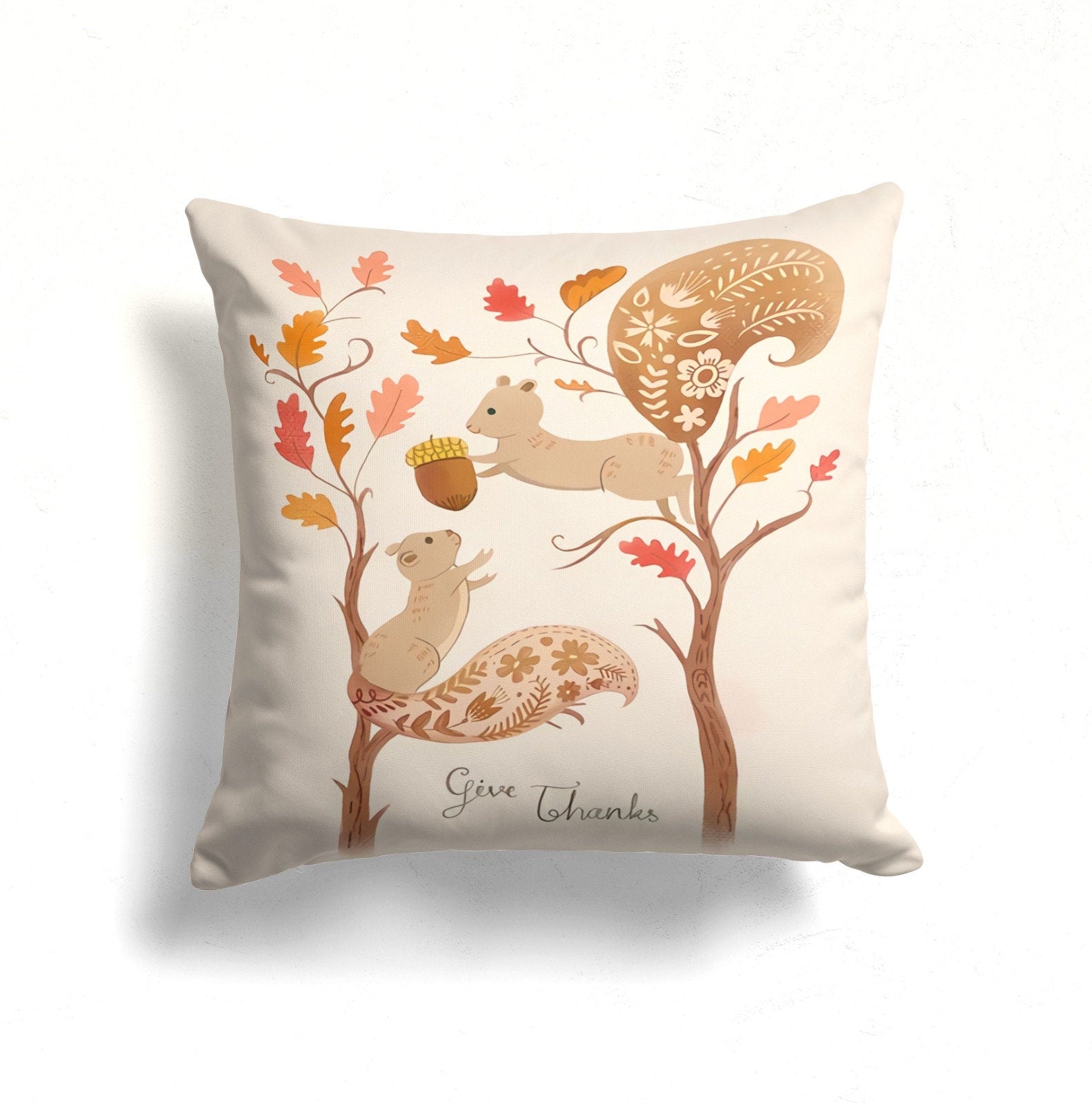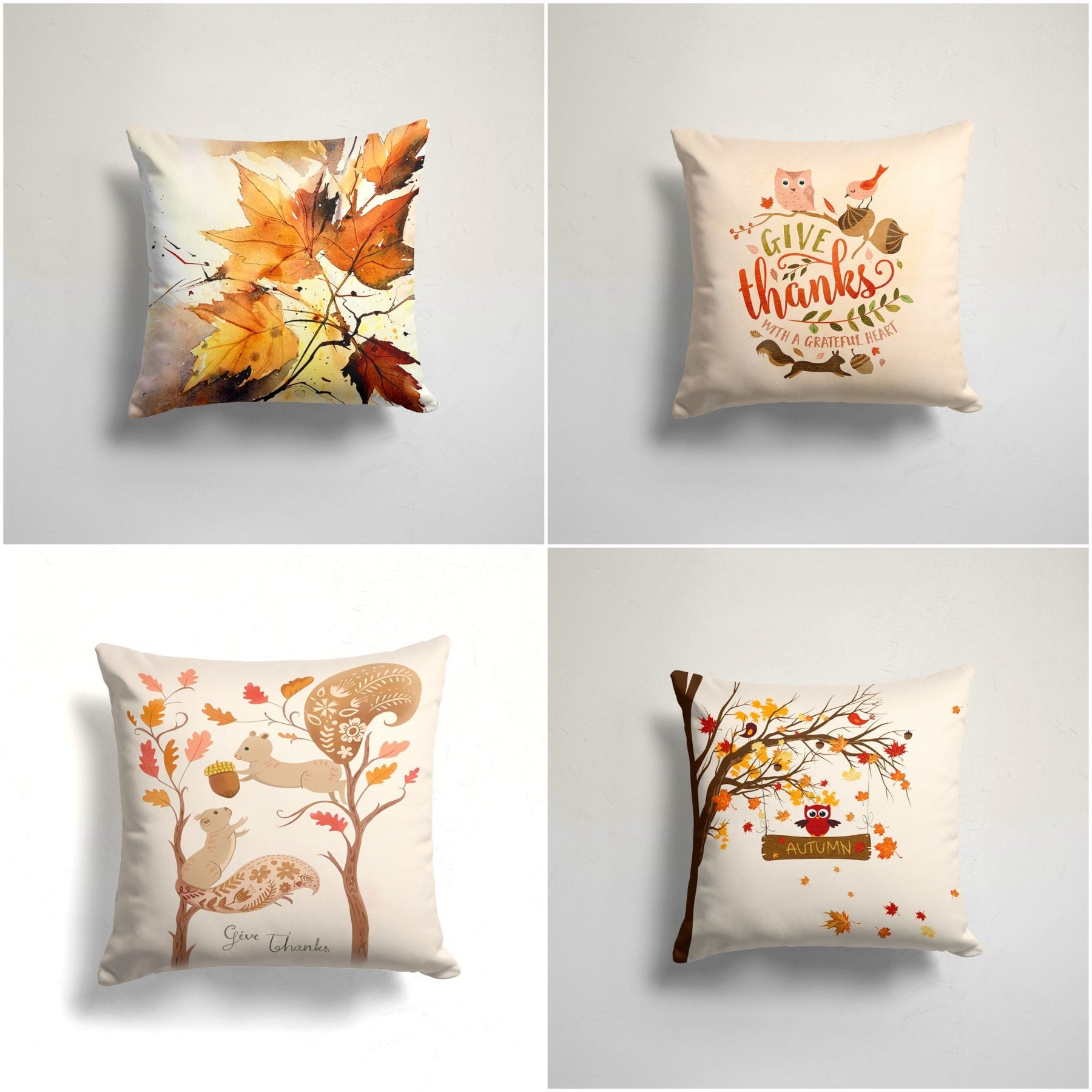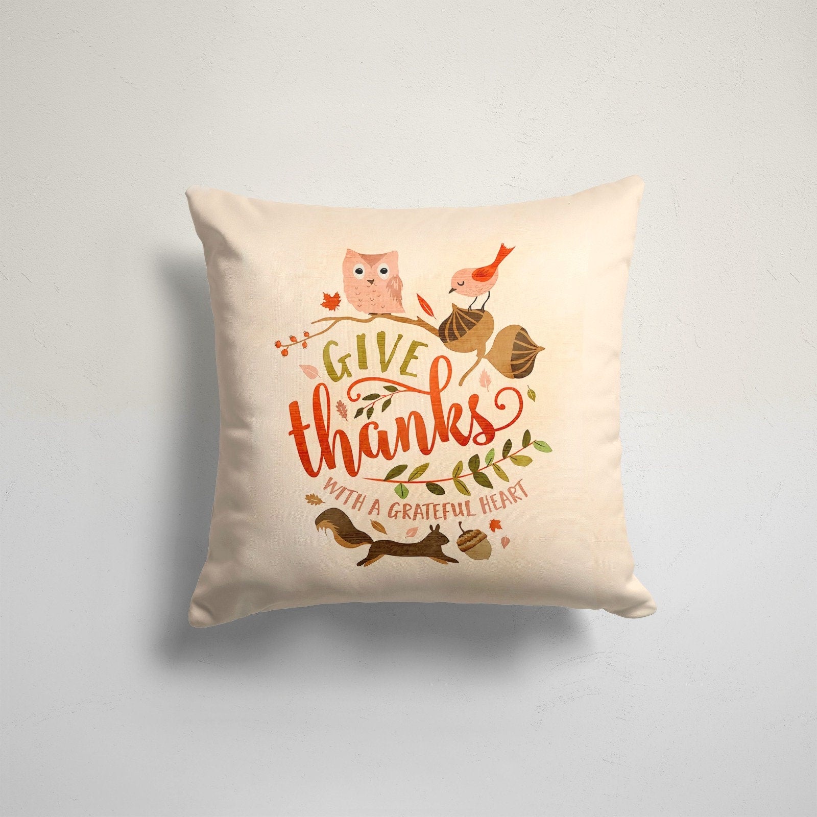 These elegant square decorative rustic farmhouse style throw cushion covers with dry leaves, Give Thanks/Give Thanks with a Grateful Heart/Autumn prints, owl, bird, squirrel, acorn, green leaves and autumn tree;
