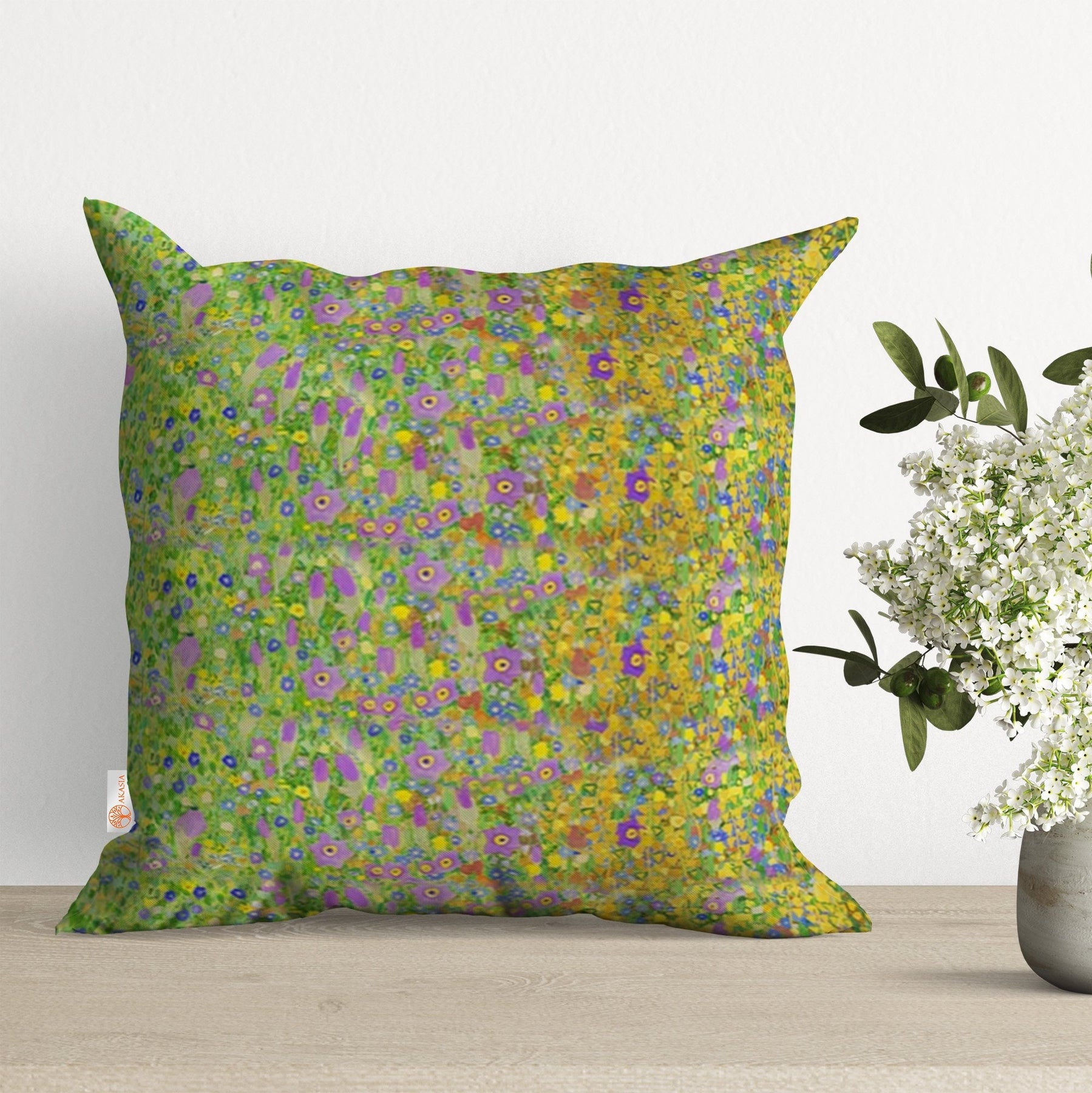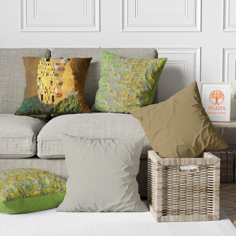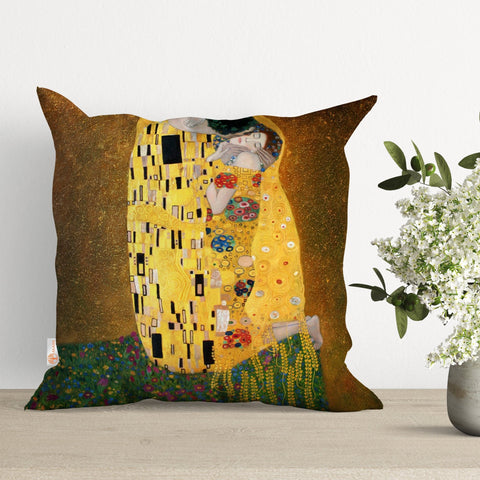These elegant square decorative farmhouse throw pillow covers with The Kiss by Gustav Klimt print;
