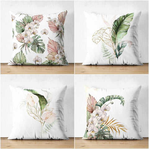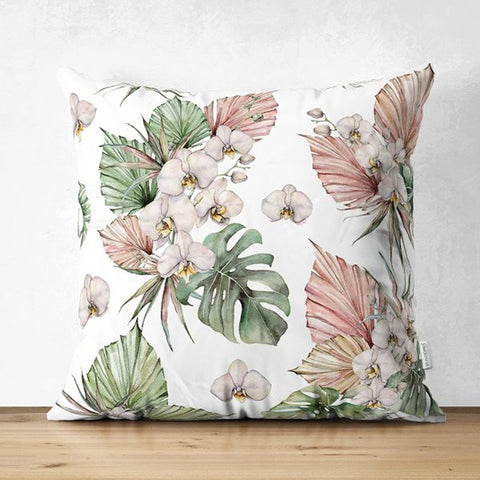 These elegant stylish and high quality suede square pillow covers with tropical green leaves and pink flowers;