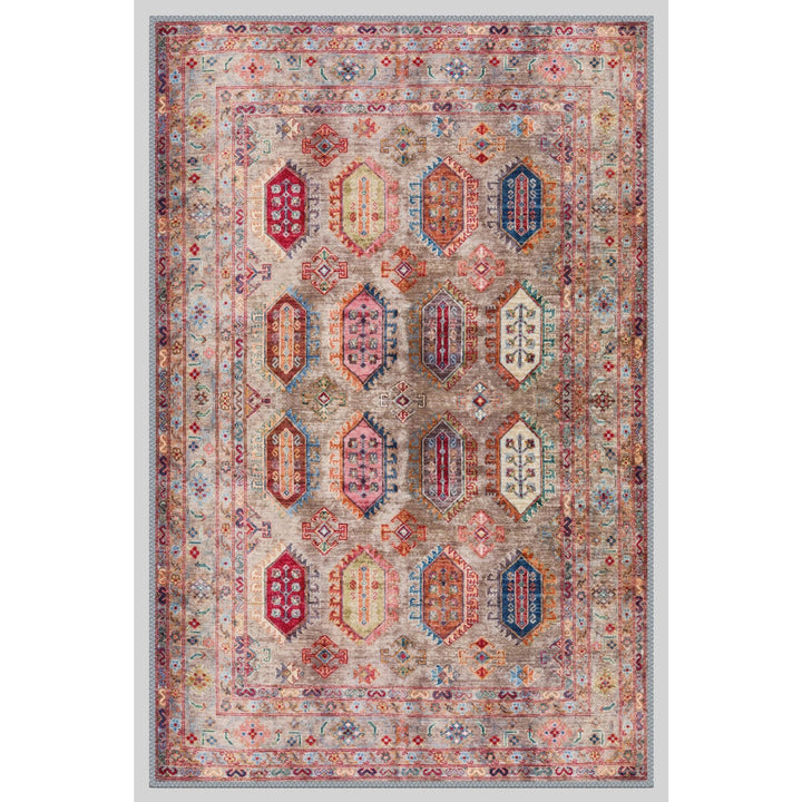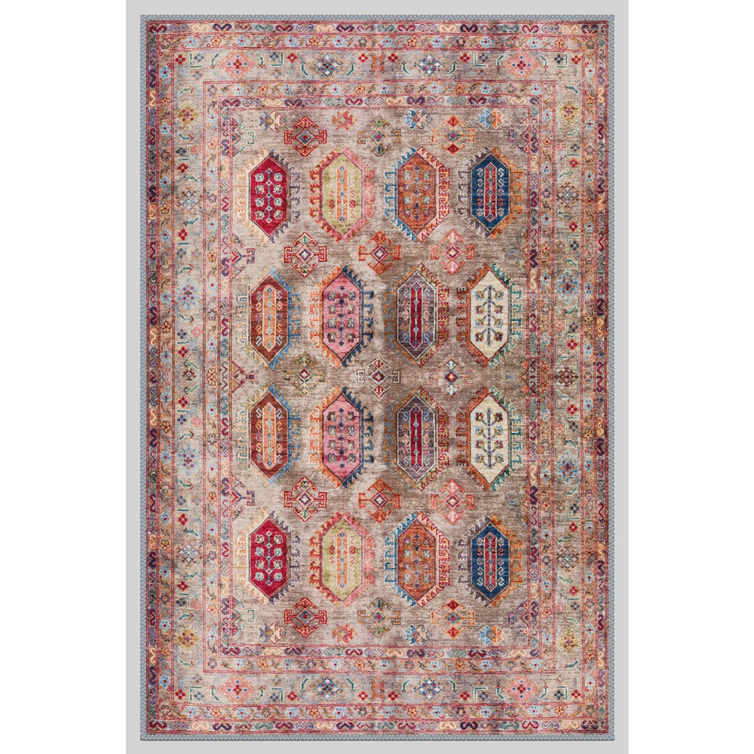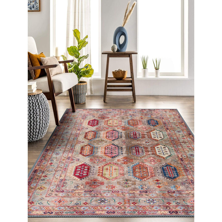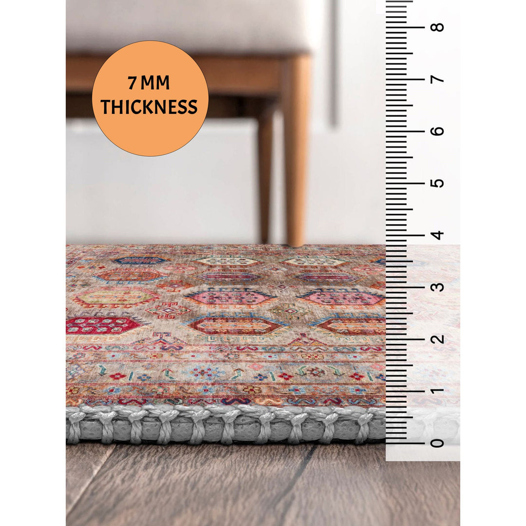 This elegant Machine-Washable floor rug with Ethnic Turkish Kilim design;