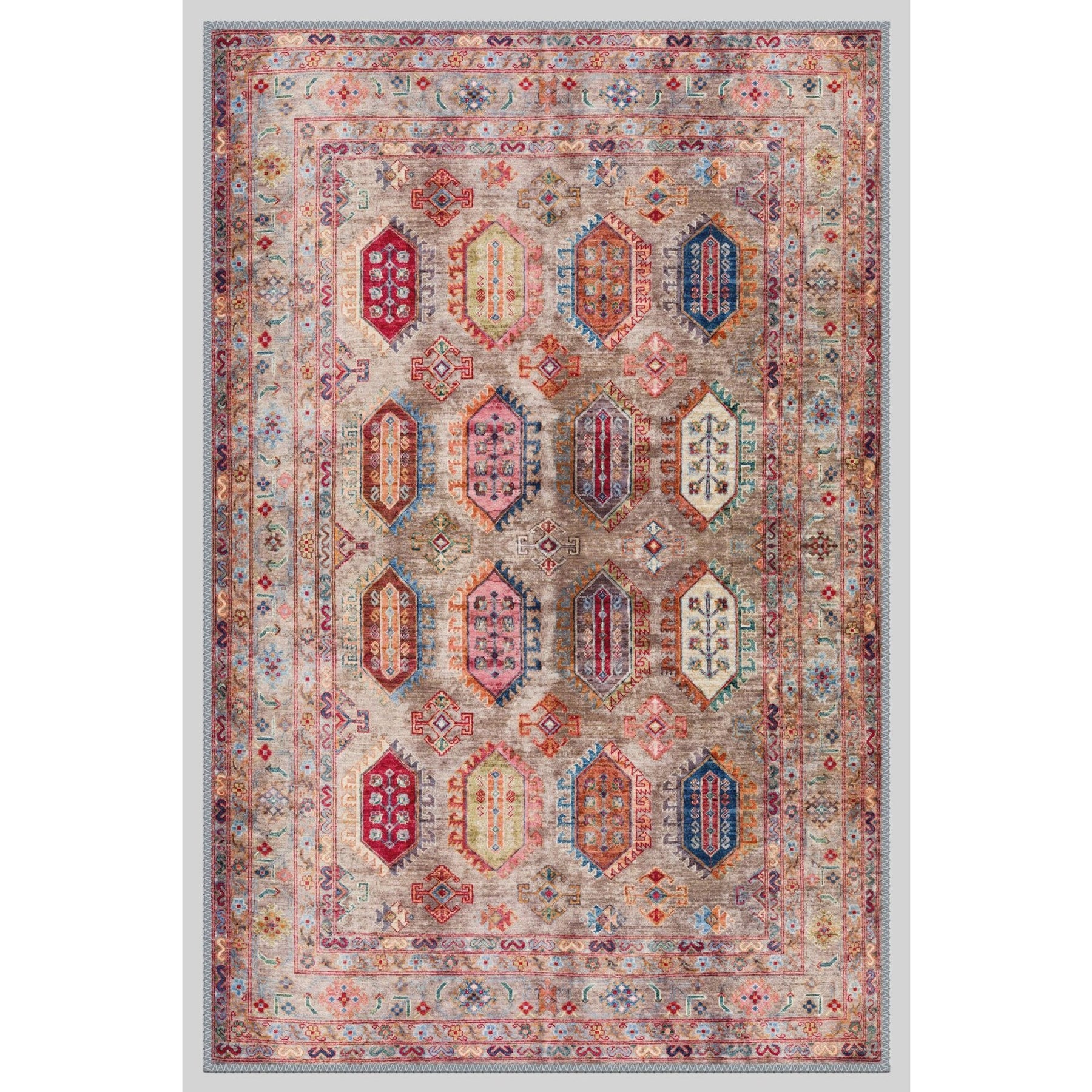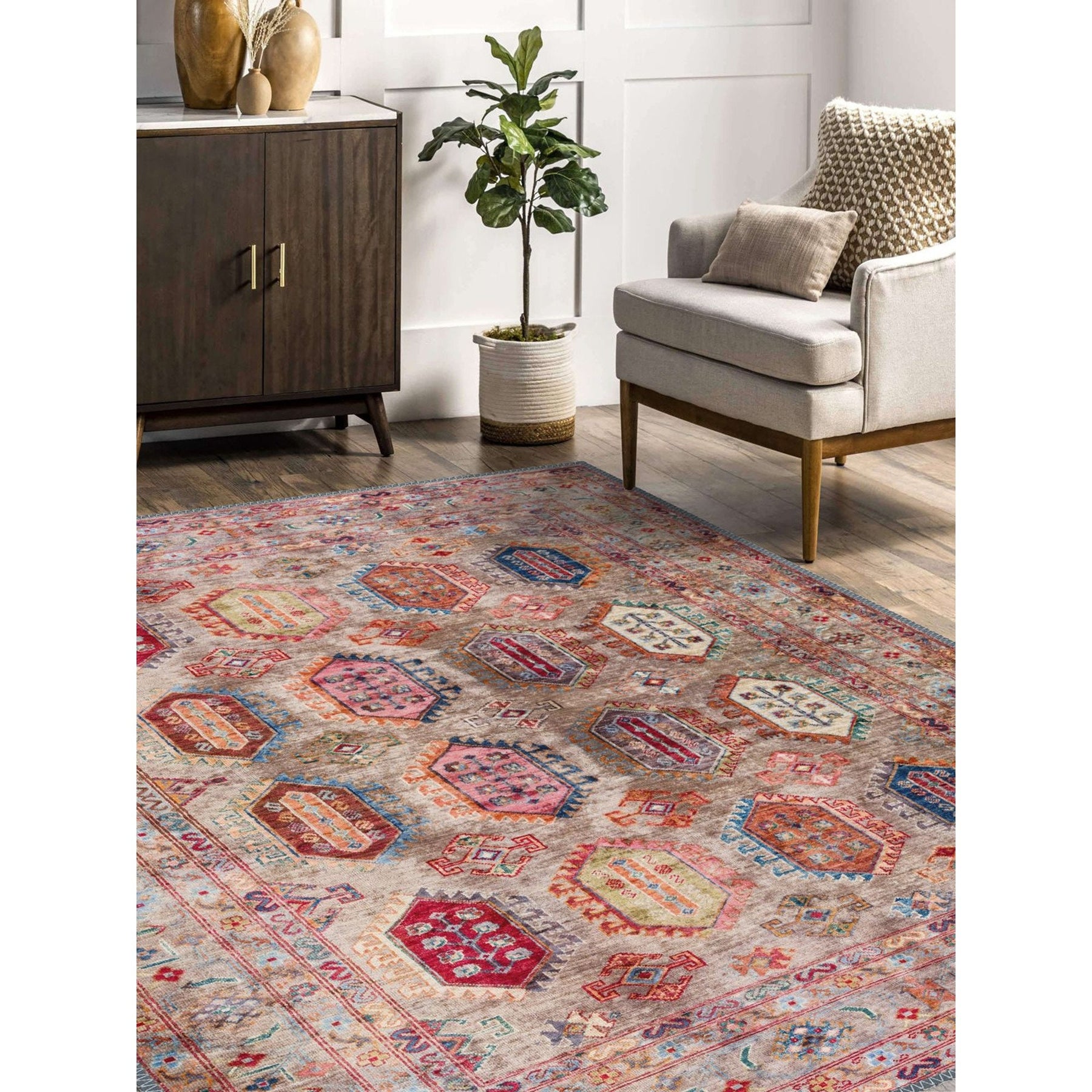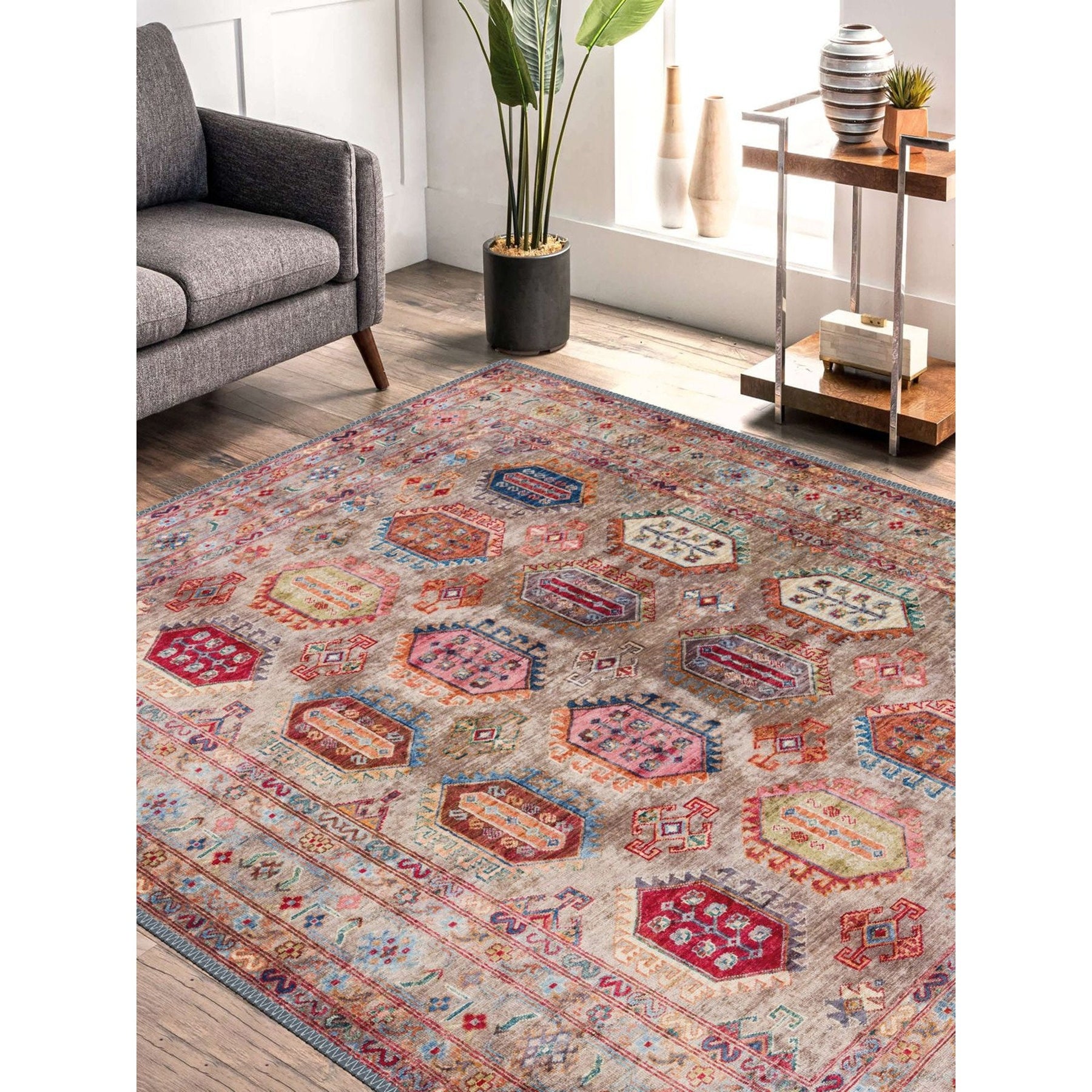 This elegant Machine-Washable floor rug with Ethnic Turkish Kilim design;