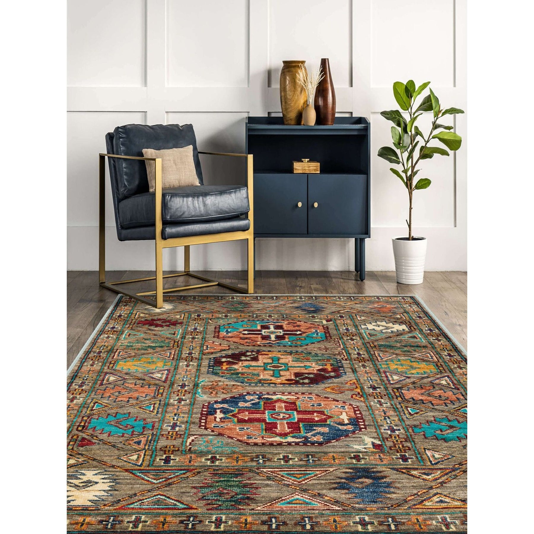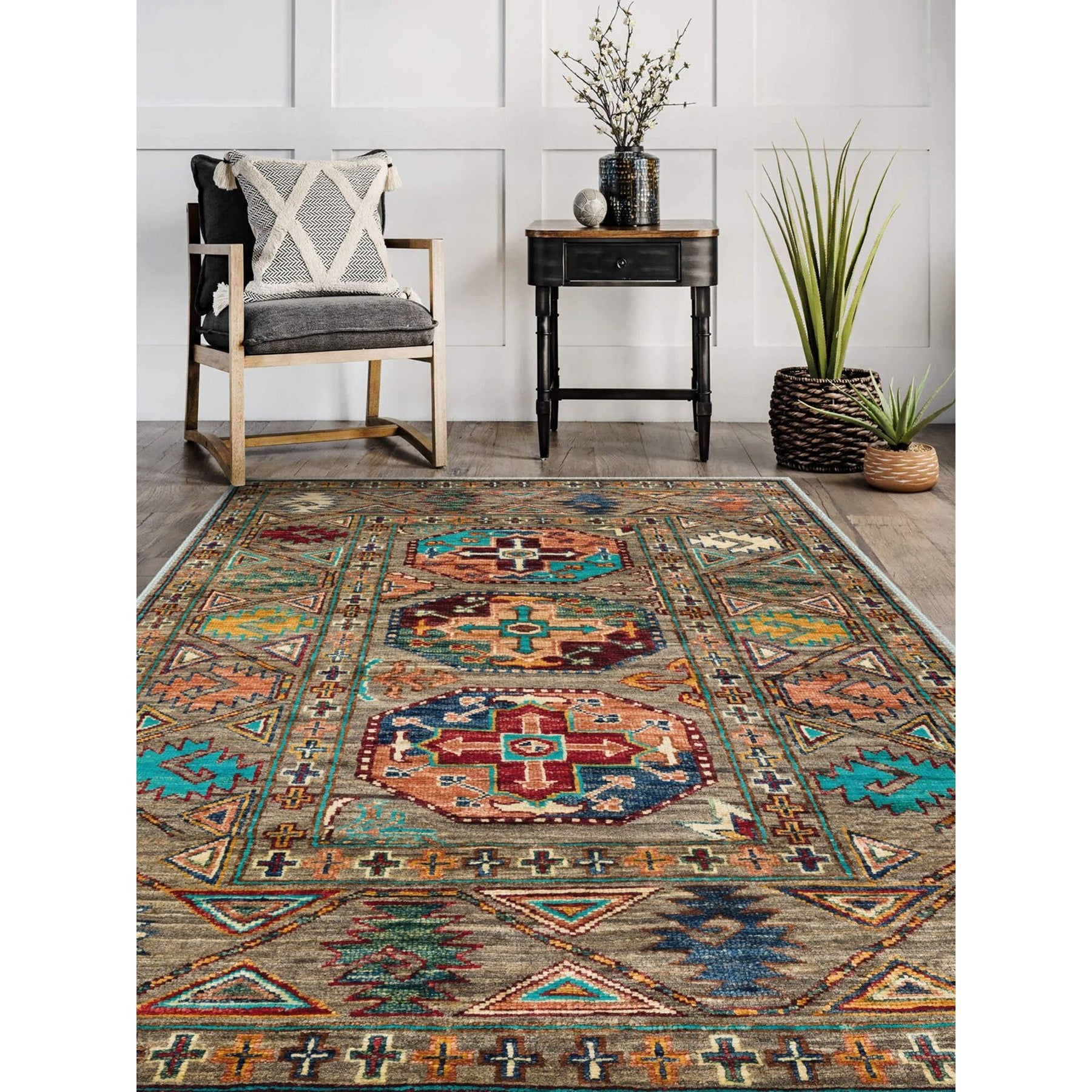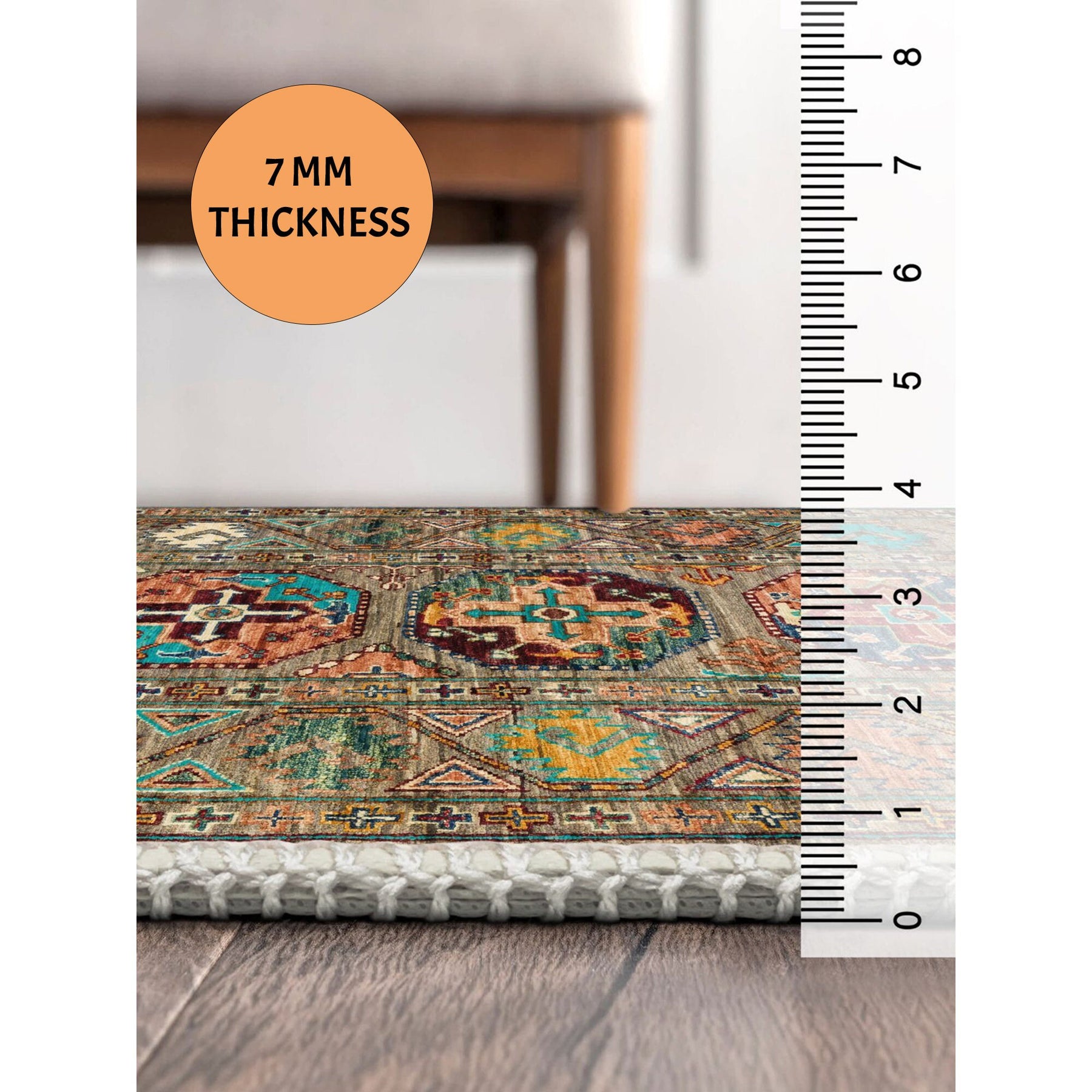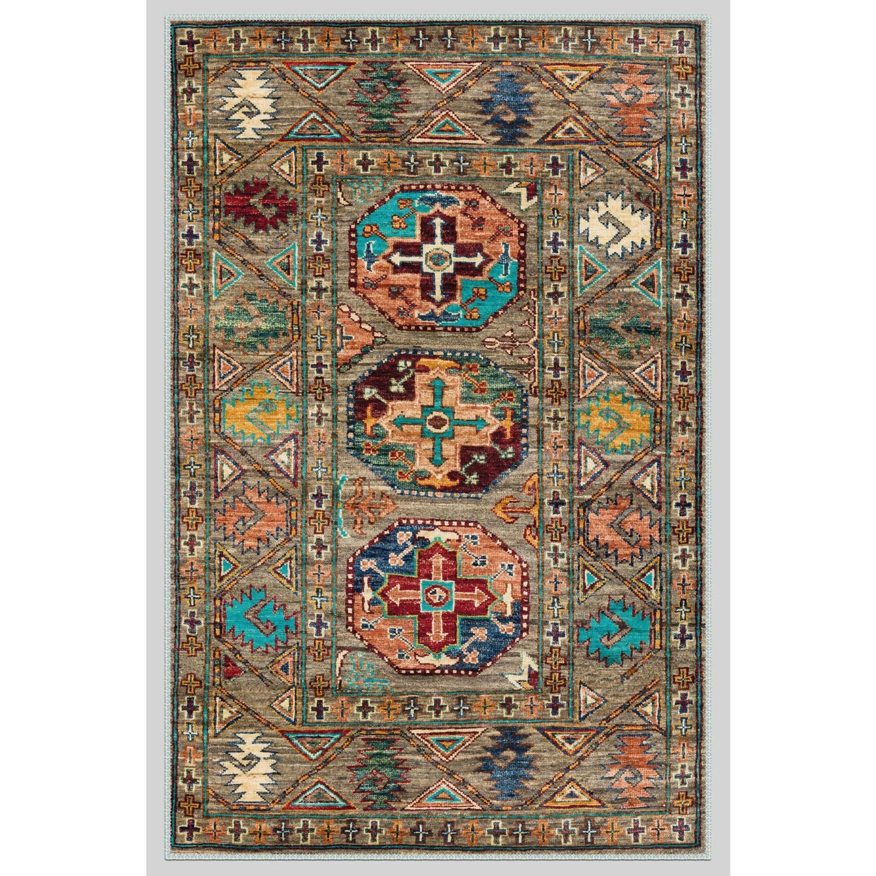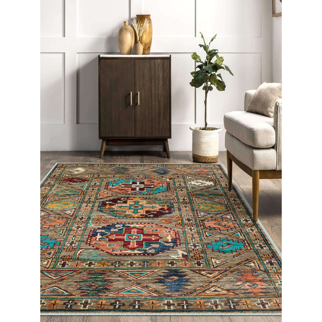 This elegant Machine-Washable floor rug with Ethnic Turkish Oriental design;