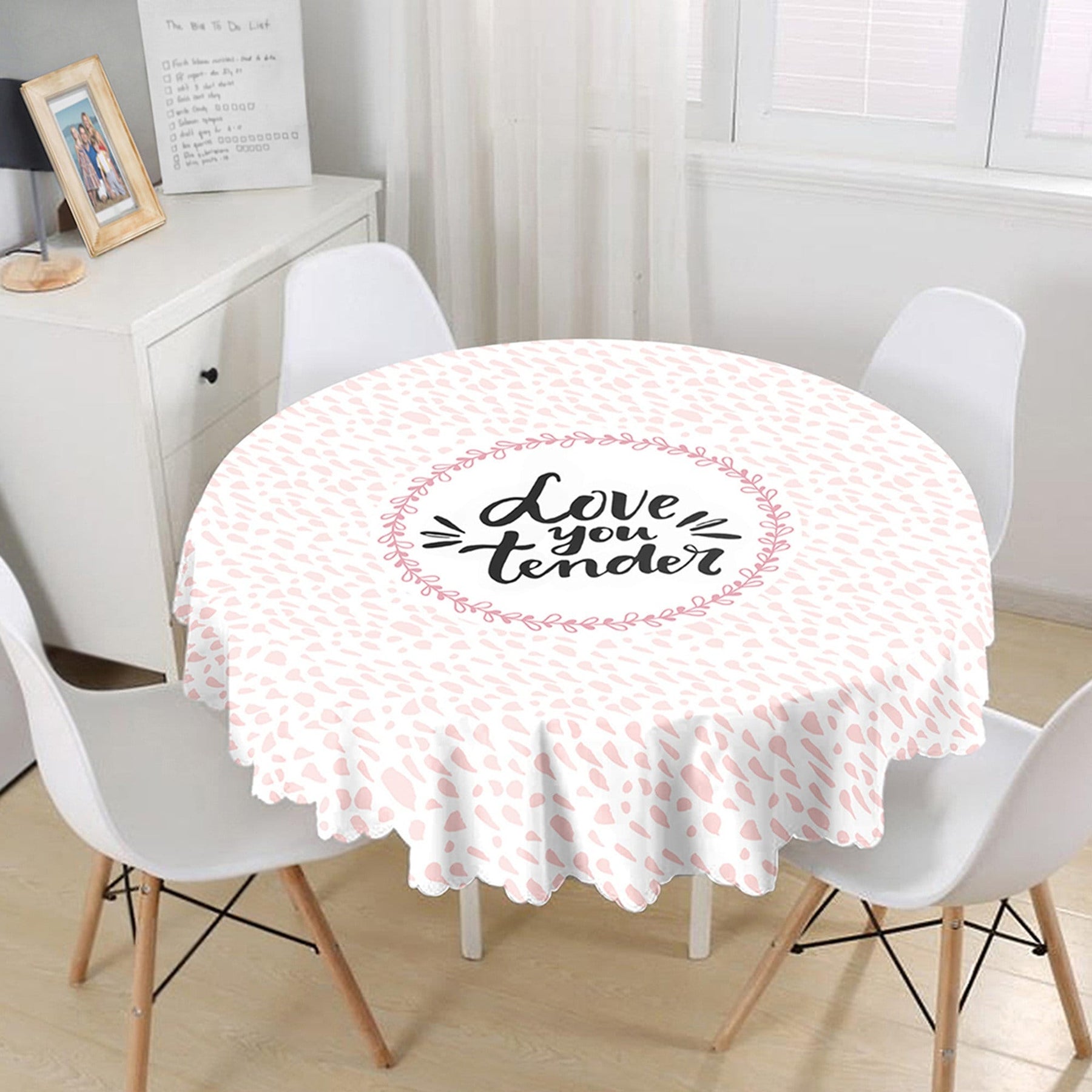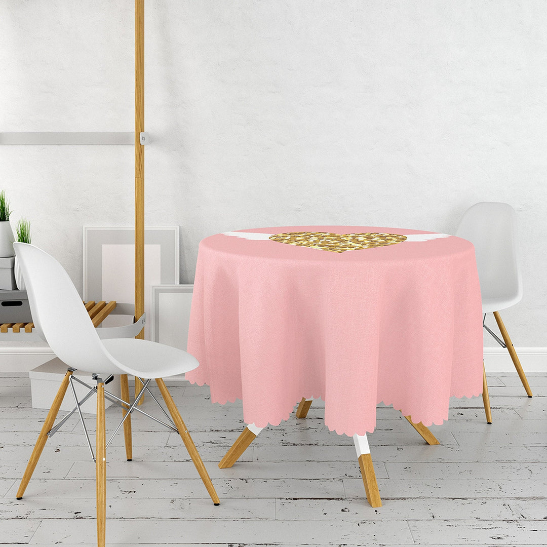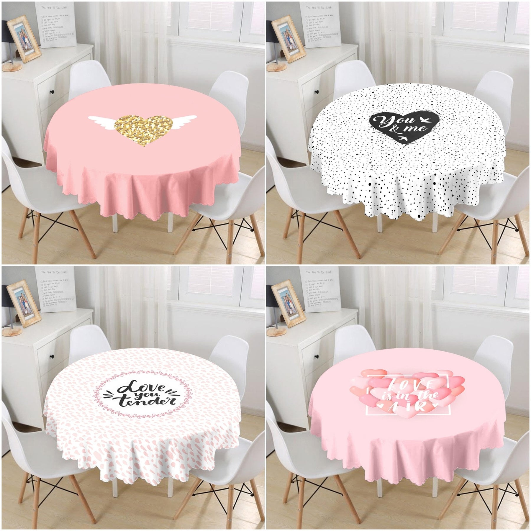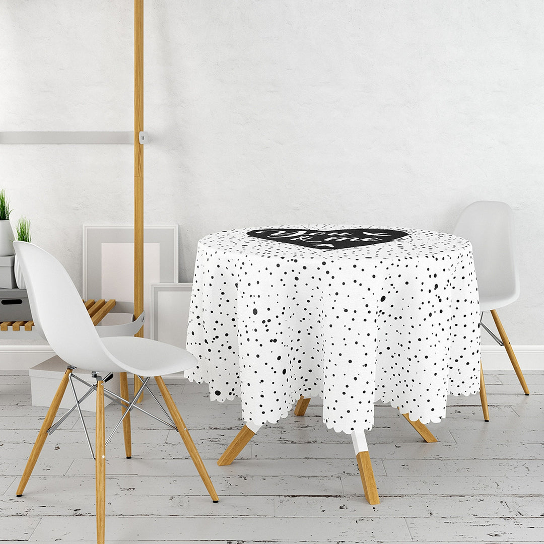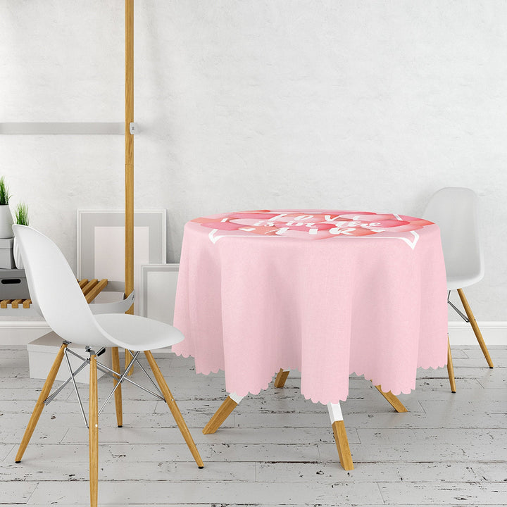 This high quality round tablecloth with Love You Tender, Love is in the Air, You and Me, heart print;