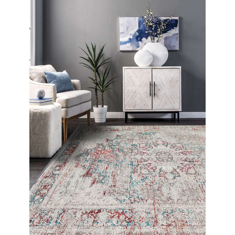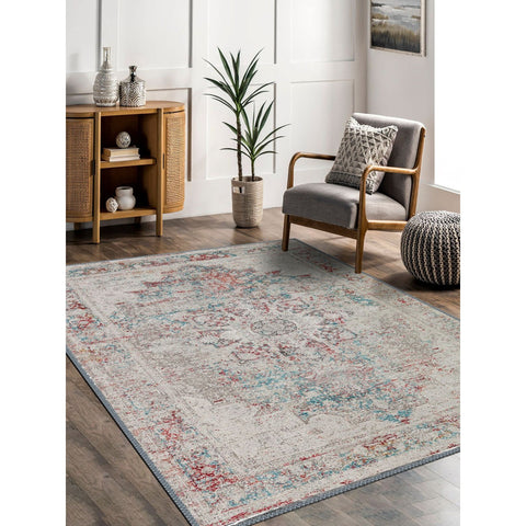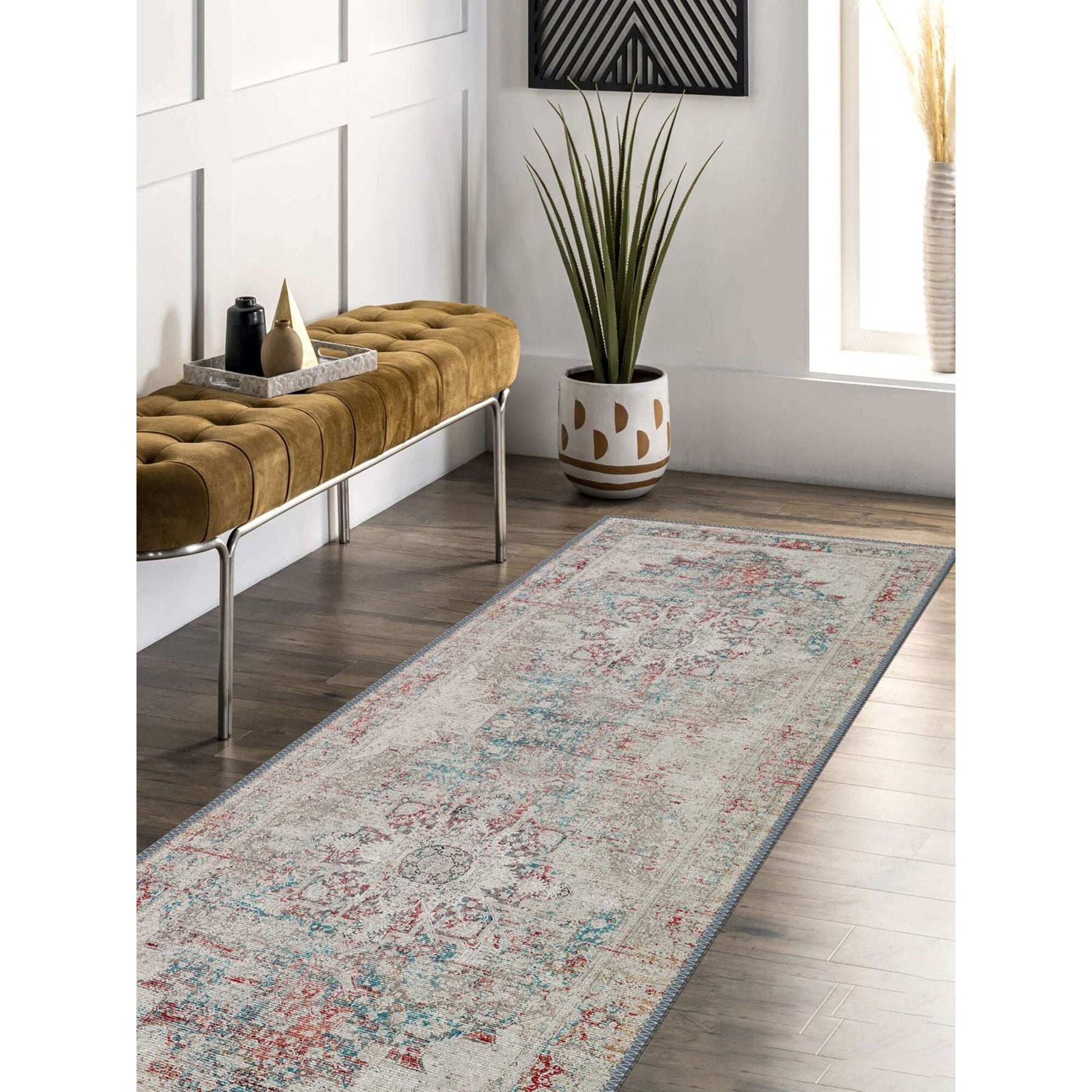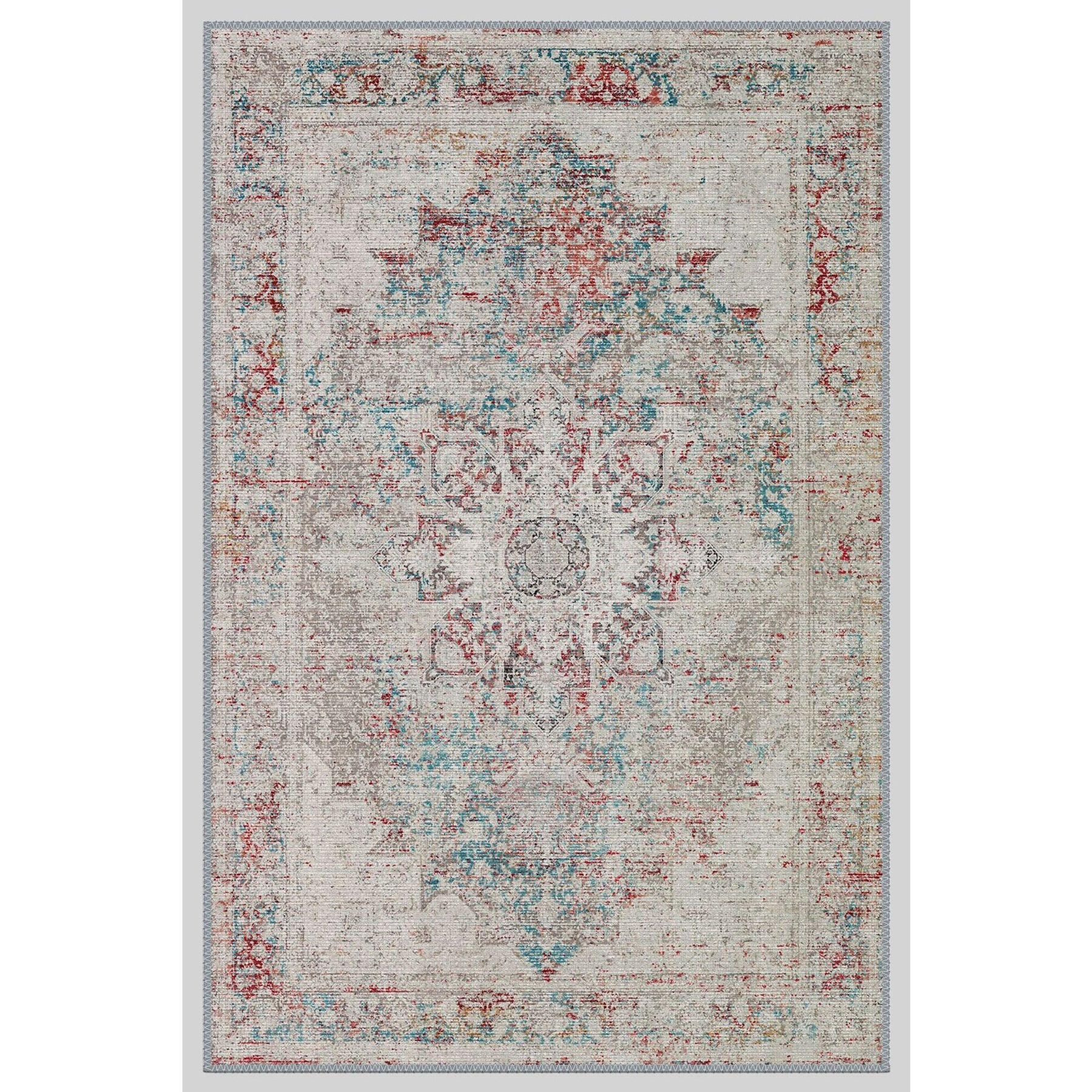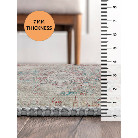 This elegant Machine-Washable floor rug with Ethnic Worn Looking Turkish Kilim design;