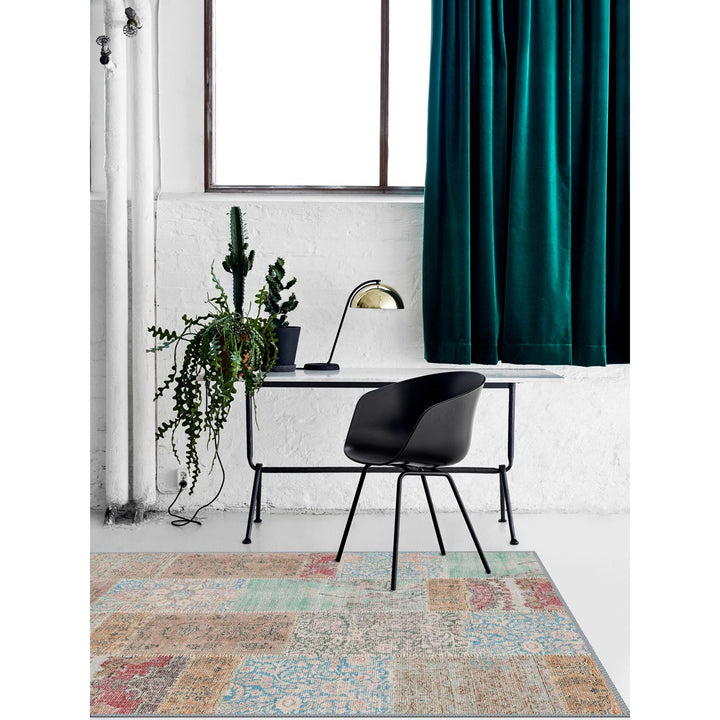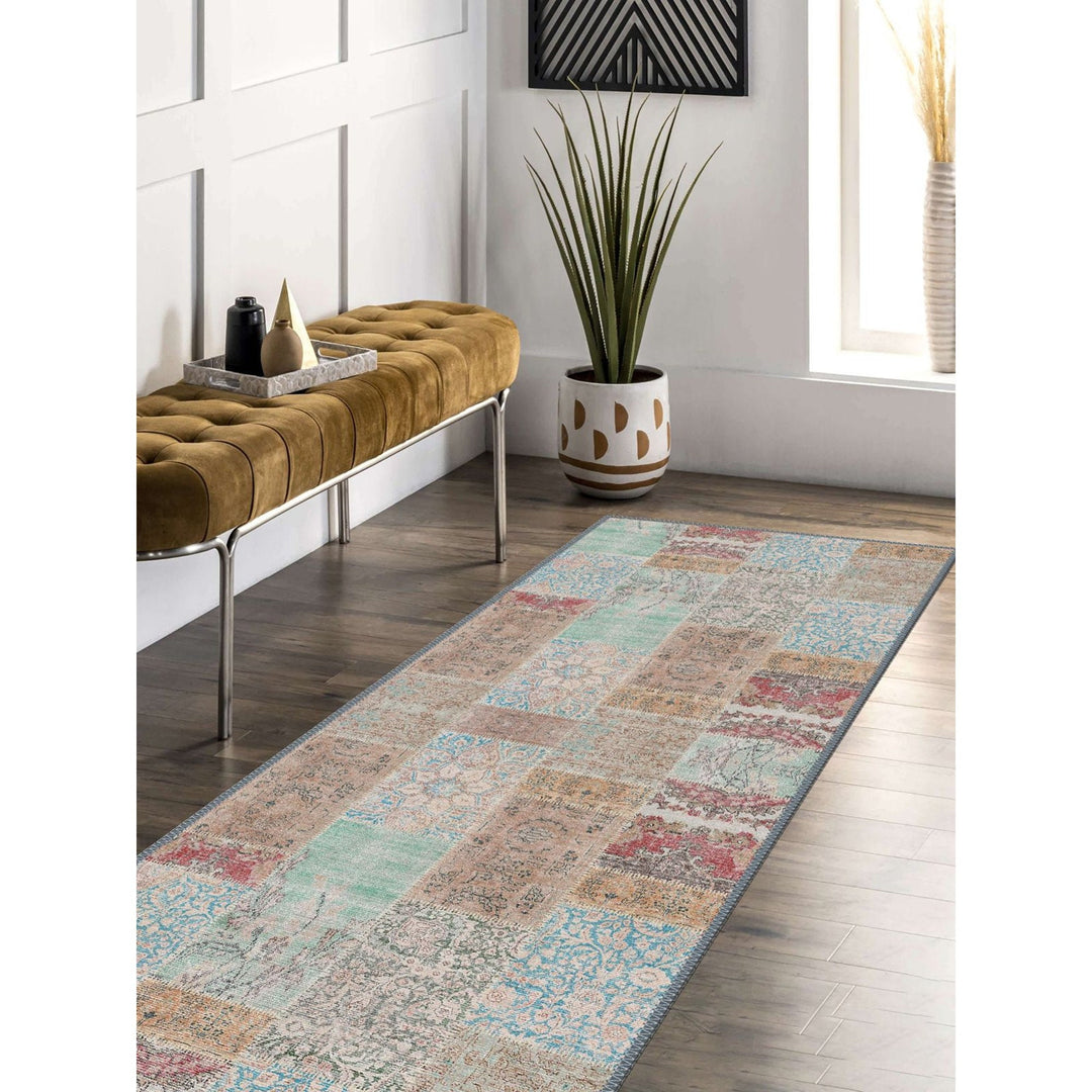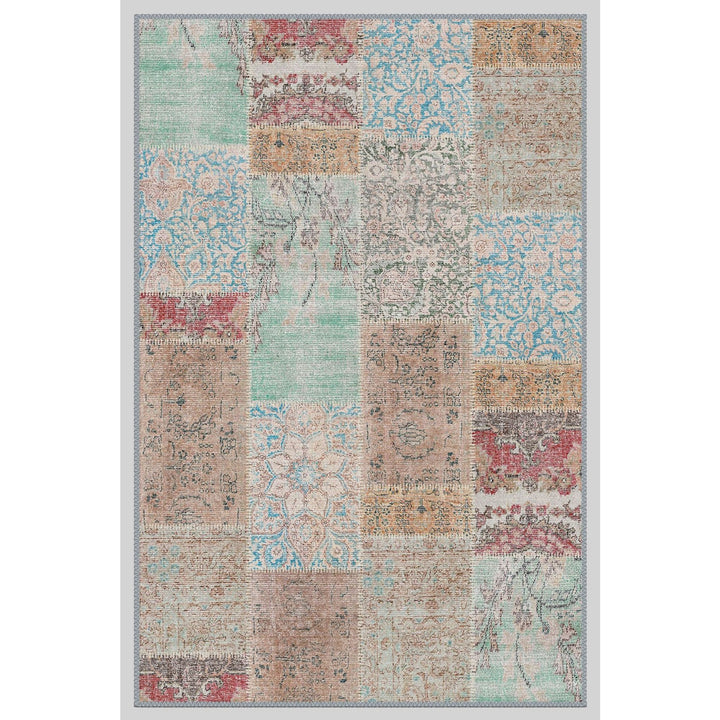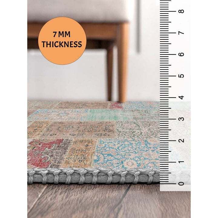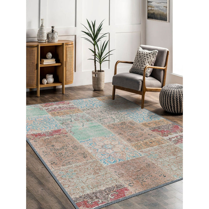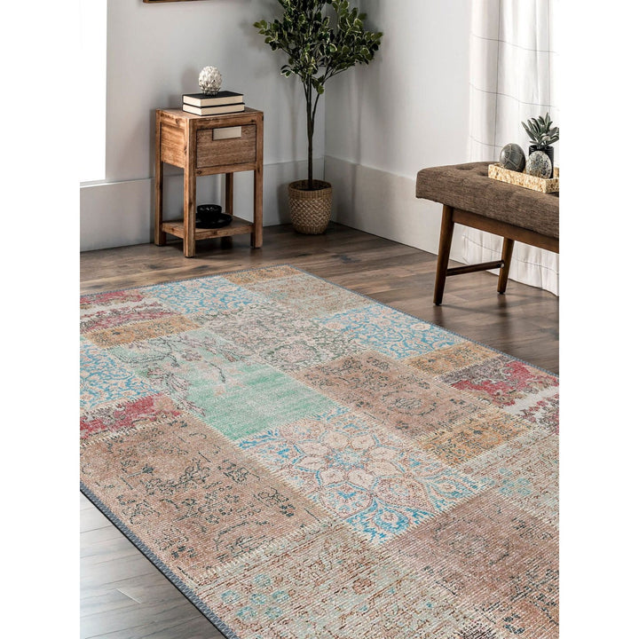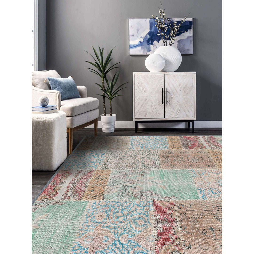 This elegant Machine-Washable floor rug with Vintage Looking Patchwork Style Turkish Kilim design;