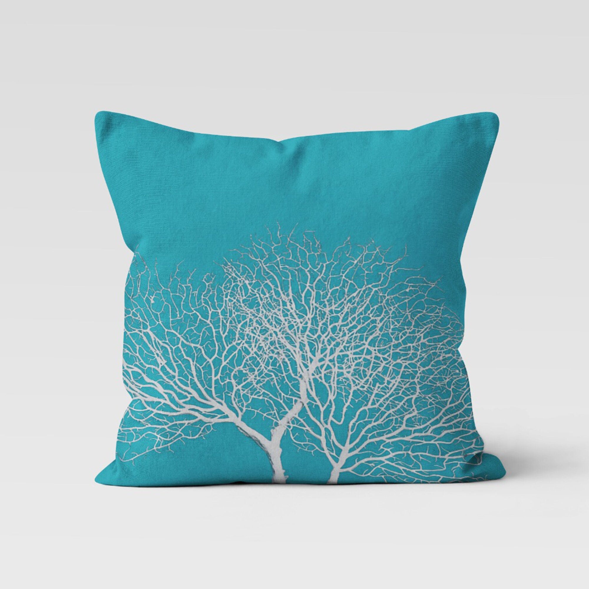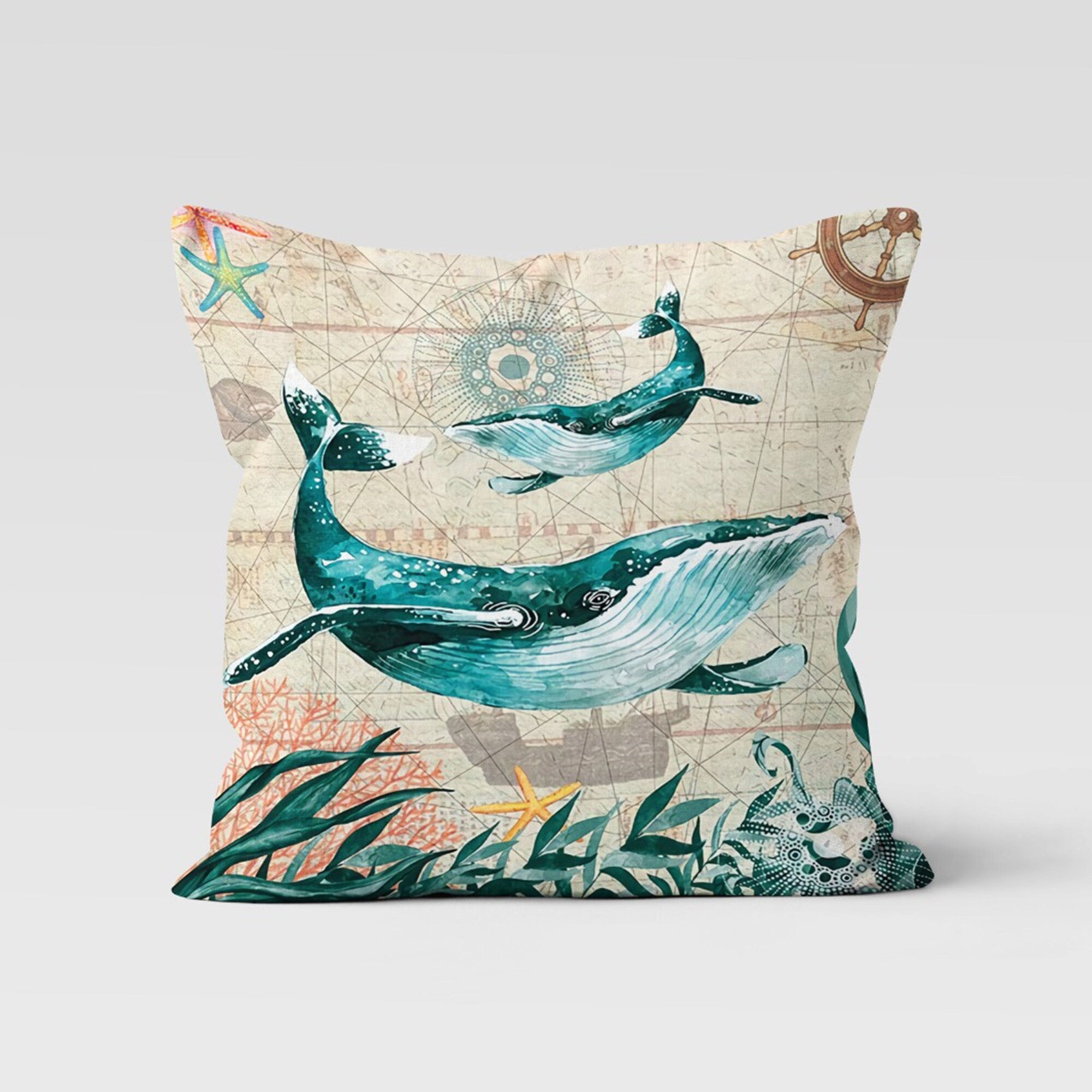 These square turquoise and beige decorative beach house throw pillow covers with whale, octopus and coral prints;