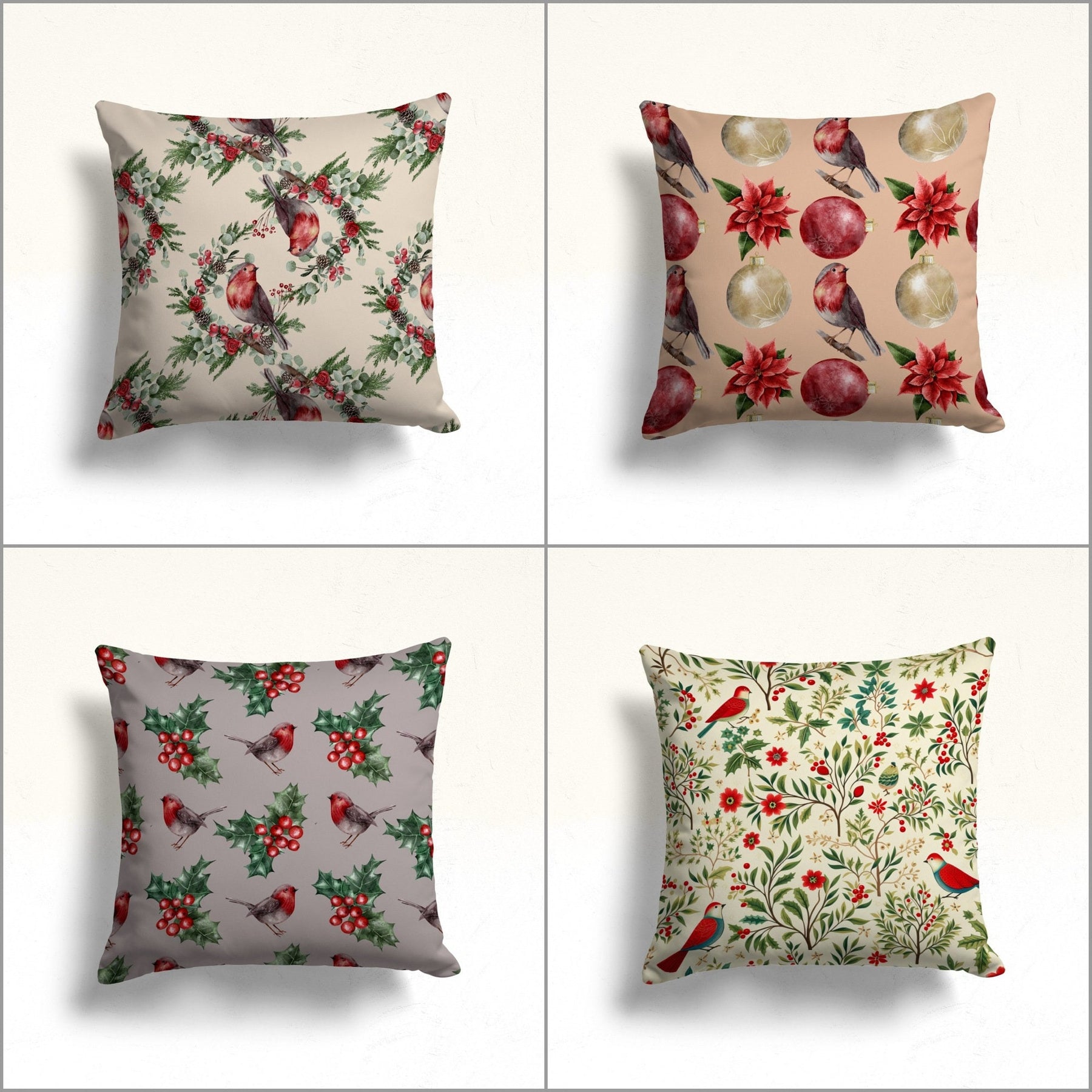 These elegant square decorative throw pillow covers with winter, Xmas ornament, red poinsettia, bird and red berry print;