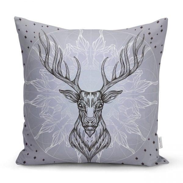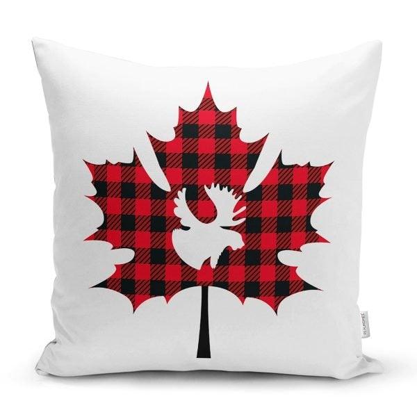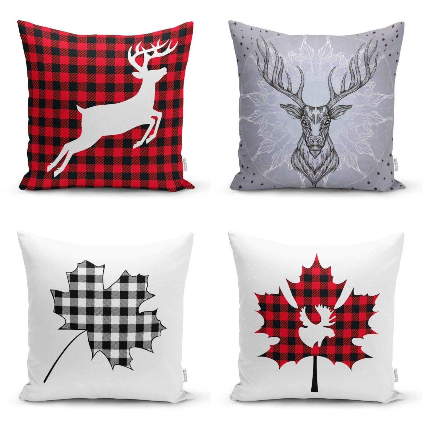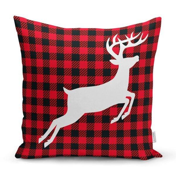 These elegant square decorative pillow covers with with white deer on red checkered background, buckhorn print, checkered leaves on white background;