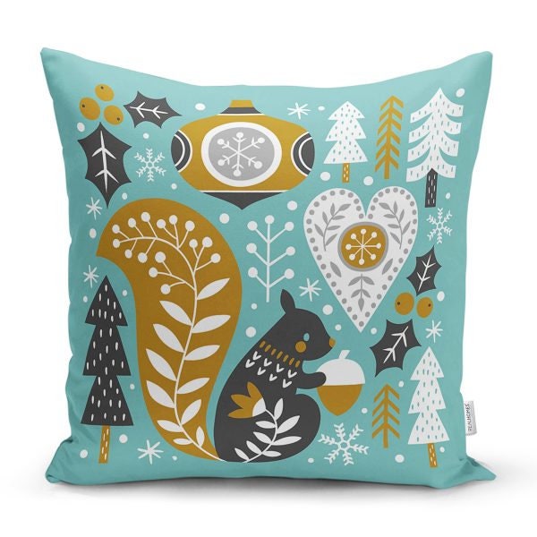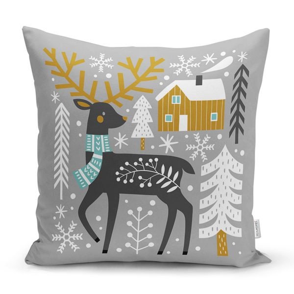 These elegant square decorative pillow covers with deer, fox, squirrel, owl, pine tree, Xmas ornaments, snowflake, snow and house prints;
