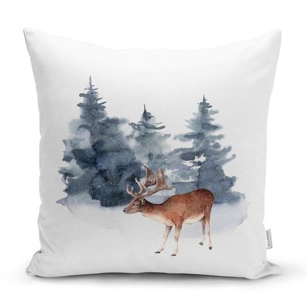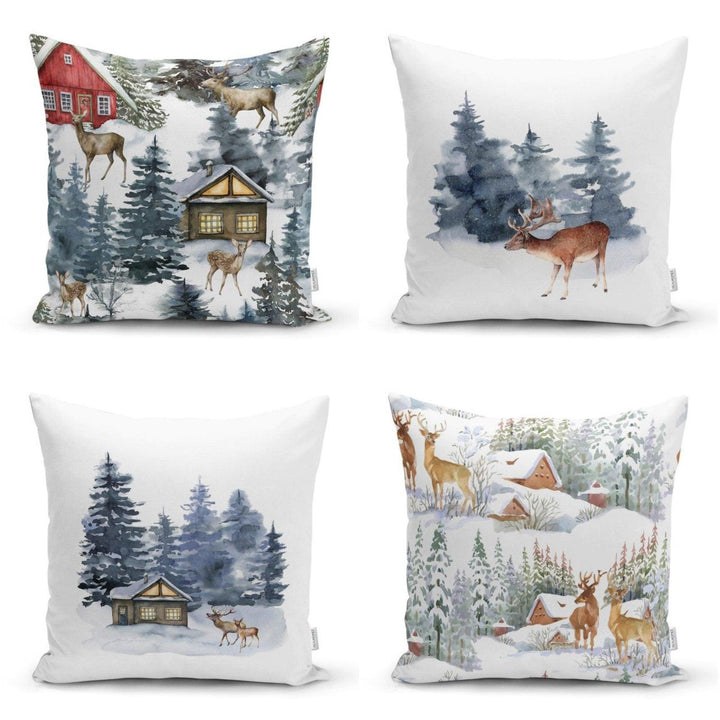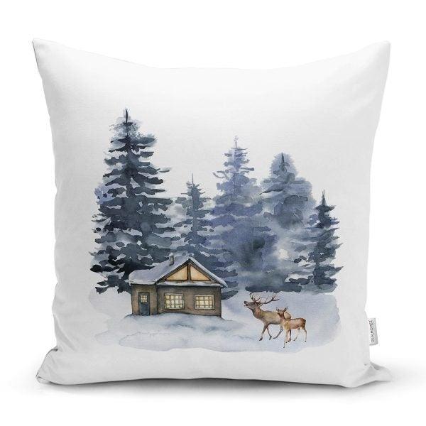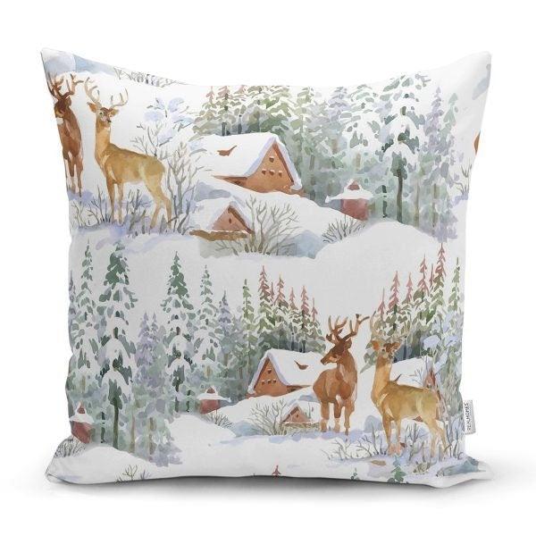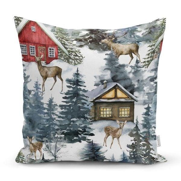 These elegant square decorative pillow covers with deer, pine tree, snow and houses;