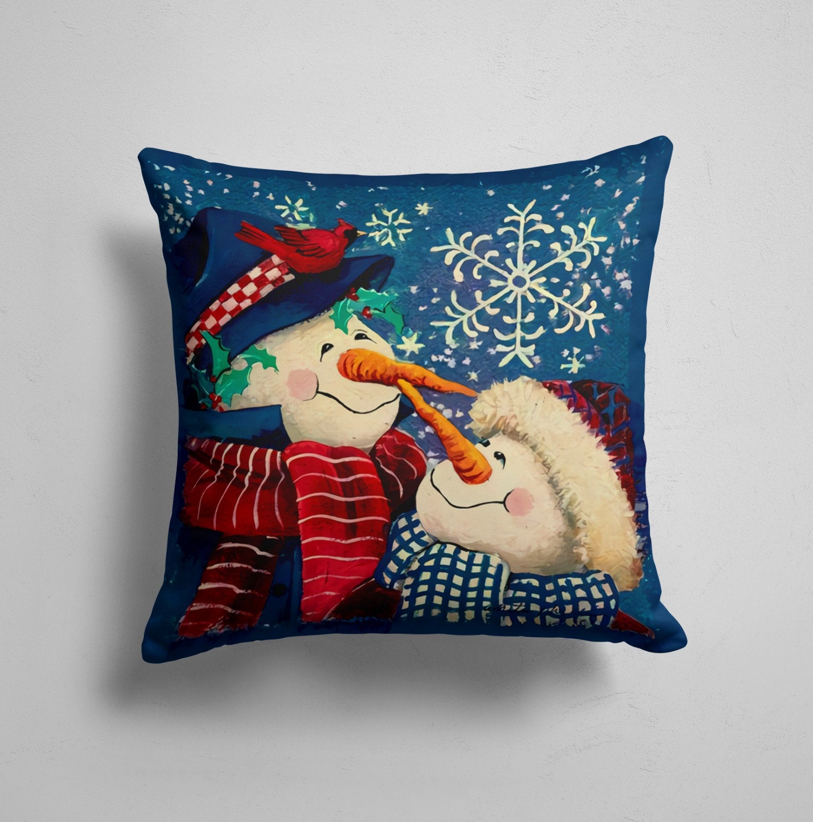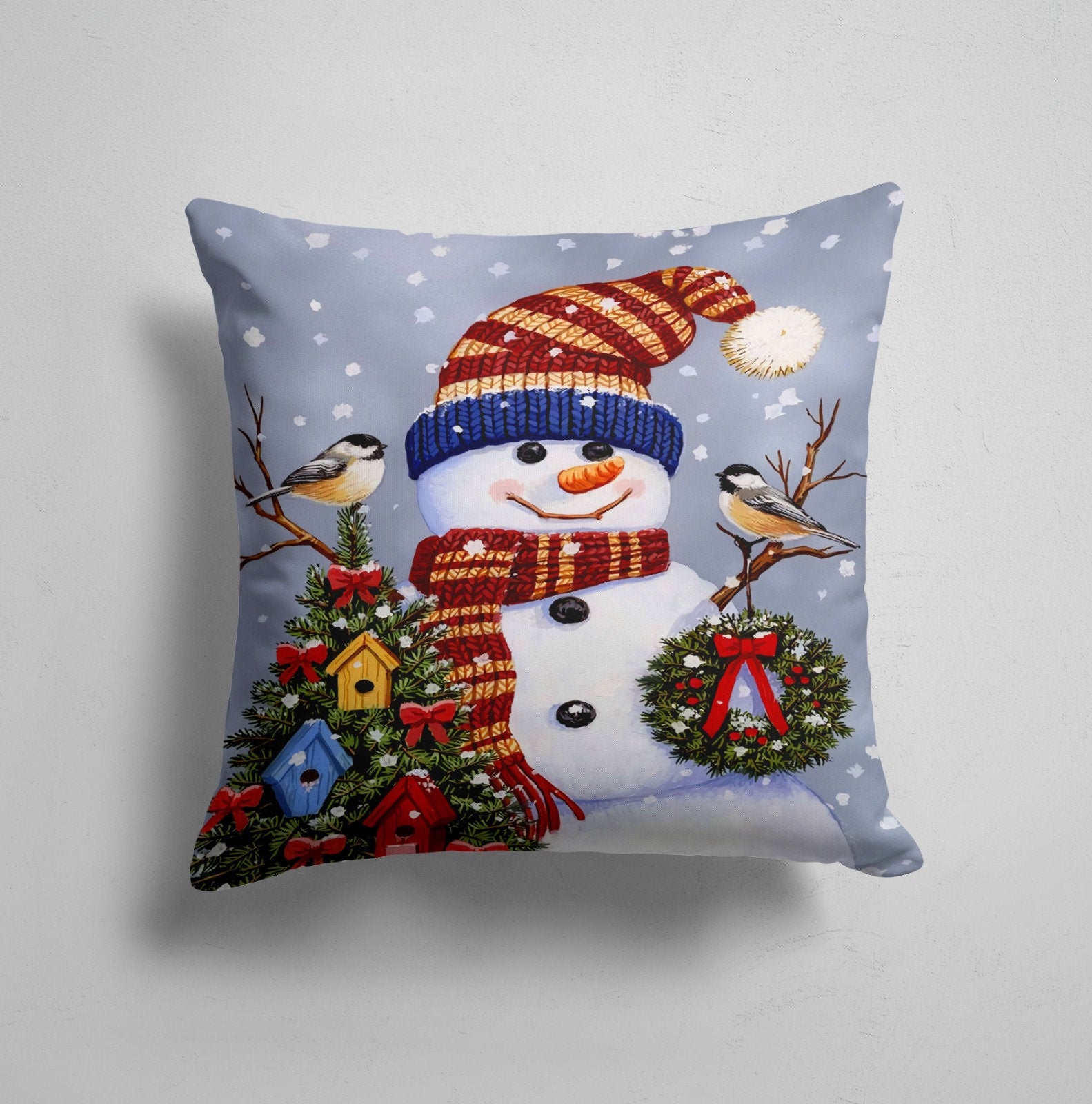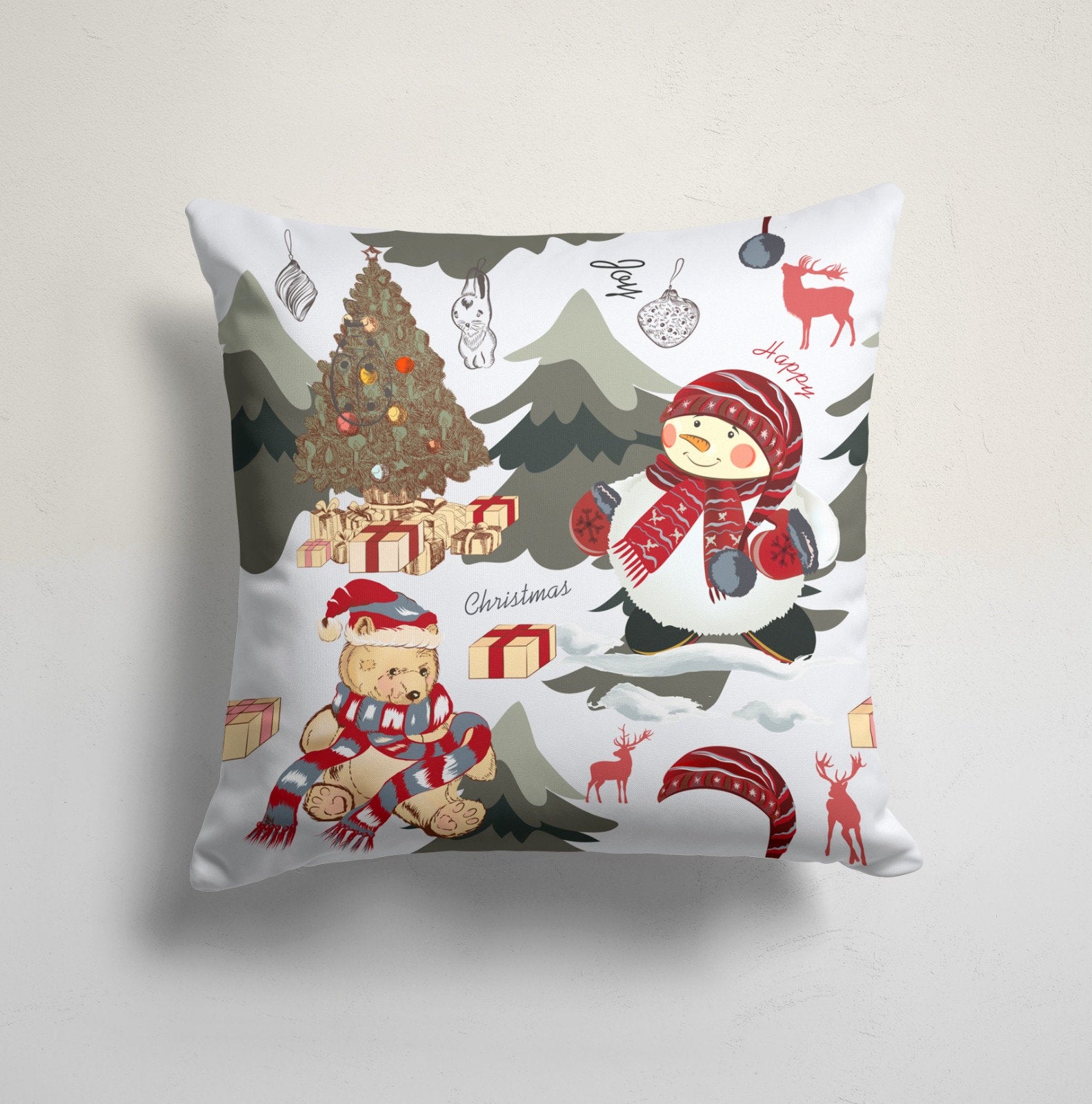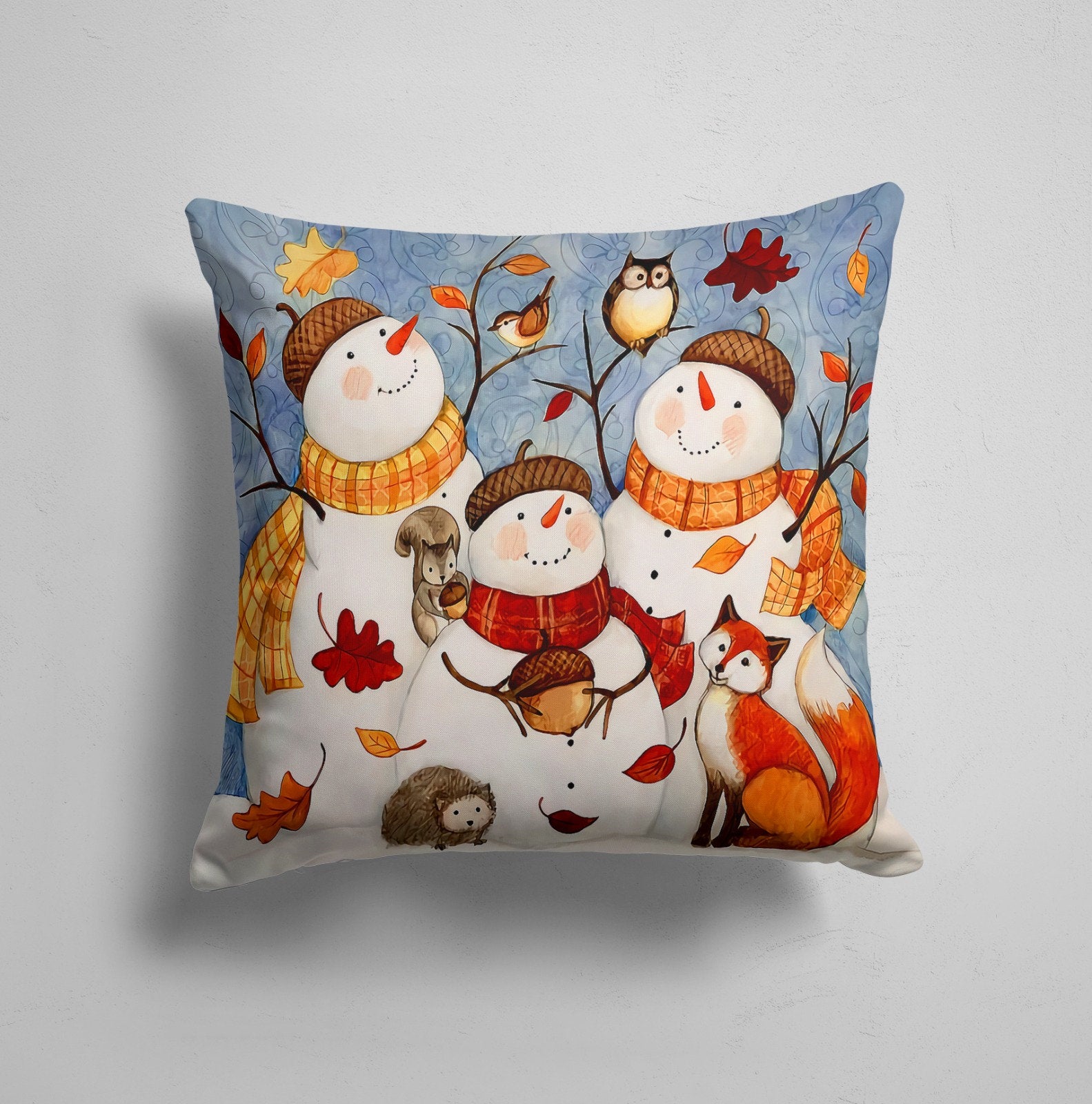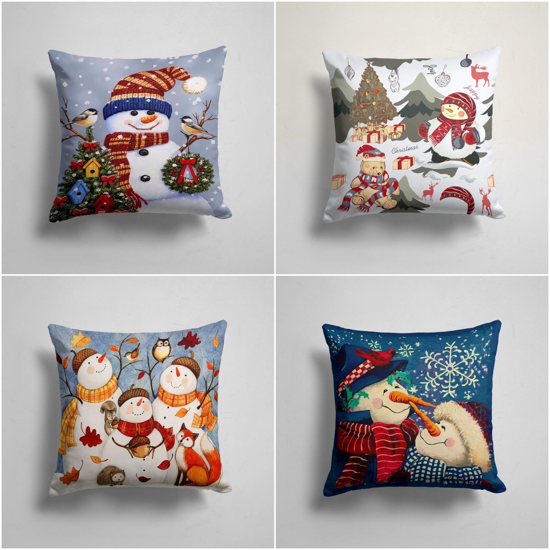 These elegant square decorative farmhouse style throw cushion covers snowman, Xmas tree, deer, bear, birds, bird nests, red Cardinal bird, gift boxes, Christmas print, acorn, fox, dry leaves, owl, squirrel, hedgehog and snowflake;
