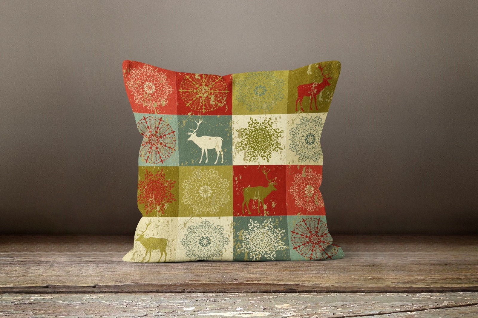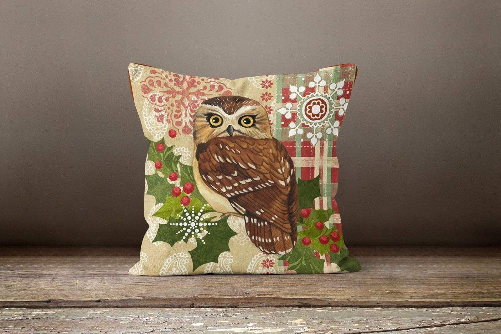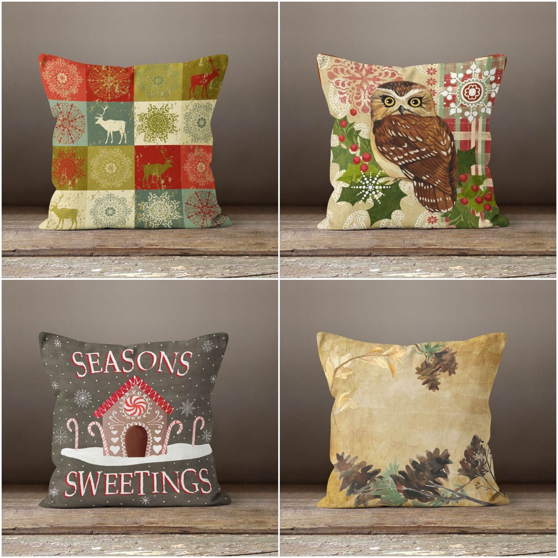 These elegant square decorative rustic farmhouse throw cushion covers with Xmas deer, owl, seasons sweetings house at winter and pine cone;