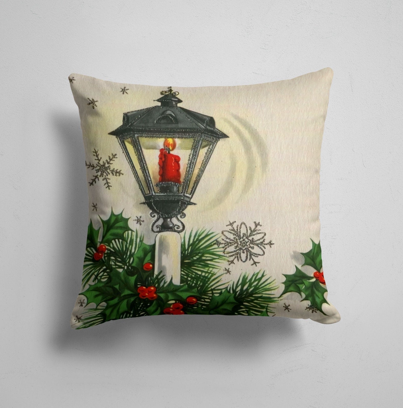 These decorative Xmas cushion covers with red berries, green leaves, red mashrooms, Xmas bell, The First Christmas was Pretty Simple It's ok if Yours is too print, red candle in the lantern, pine cone and Xmas house;
