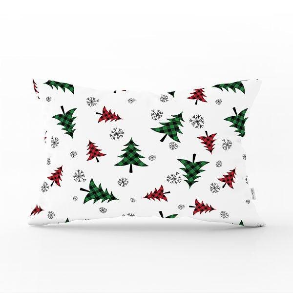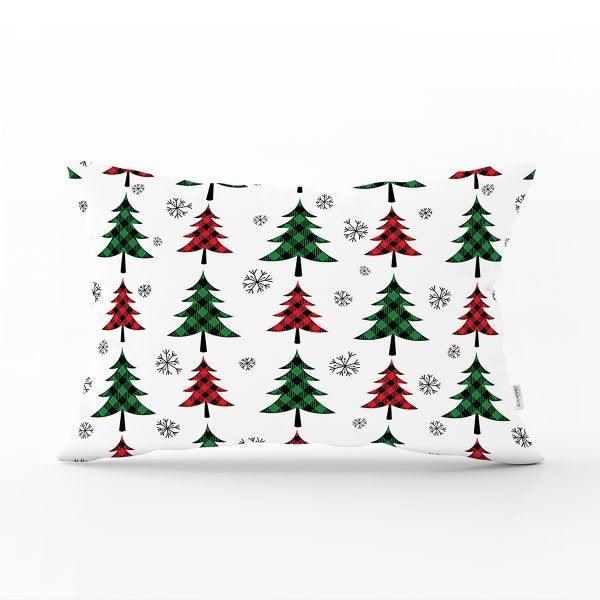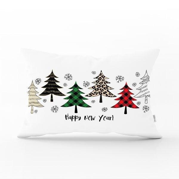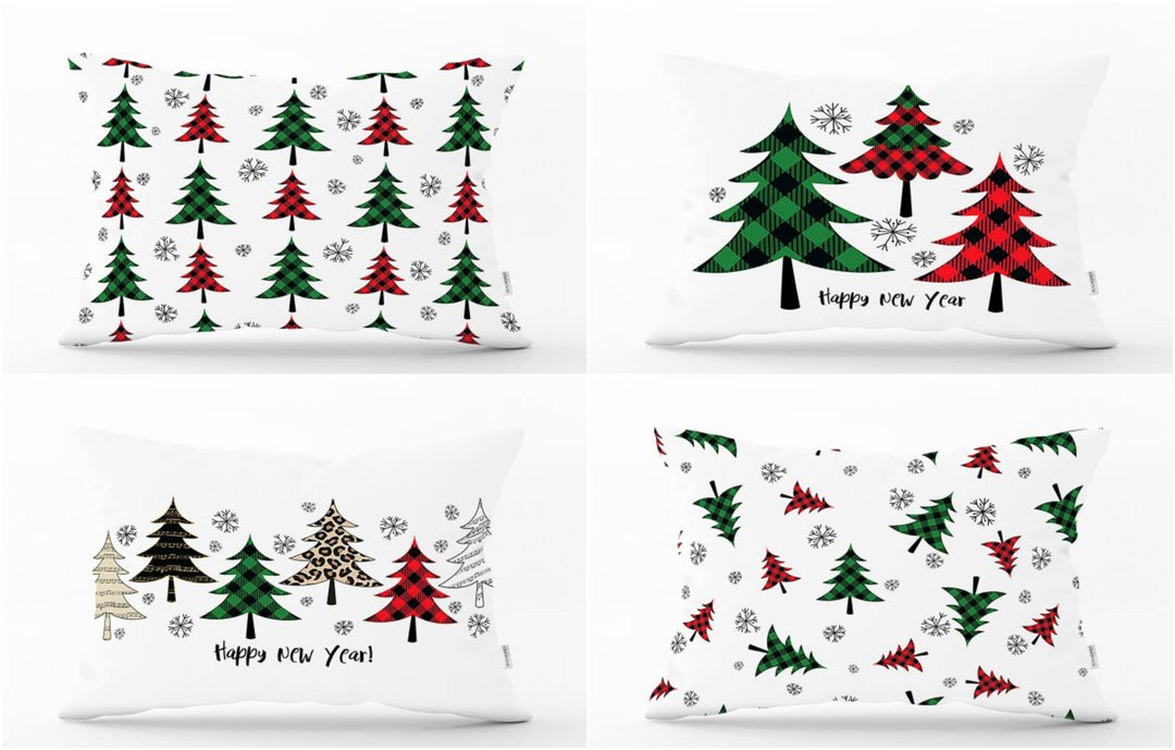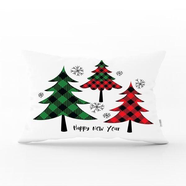 These rectangle farmhouse style pillow covers with red/green checkered pine tree and Happy New Year print;