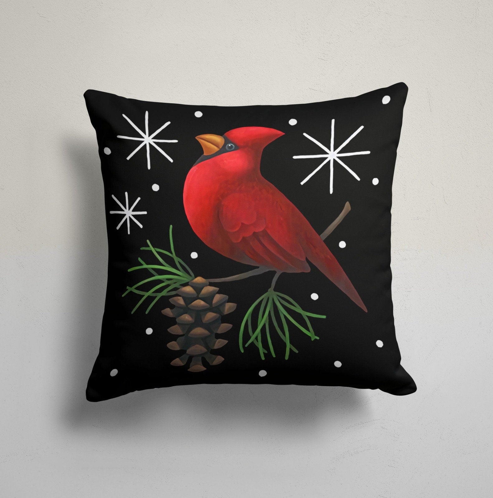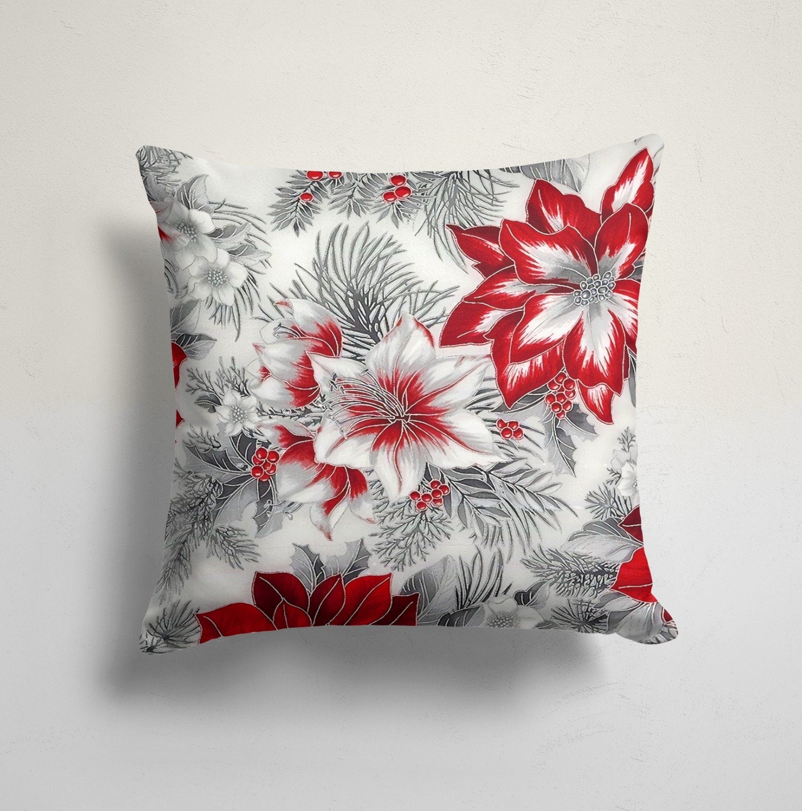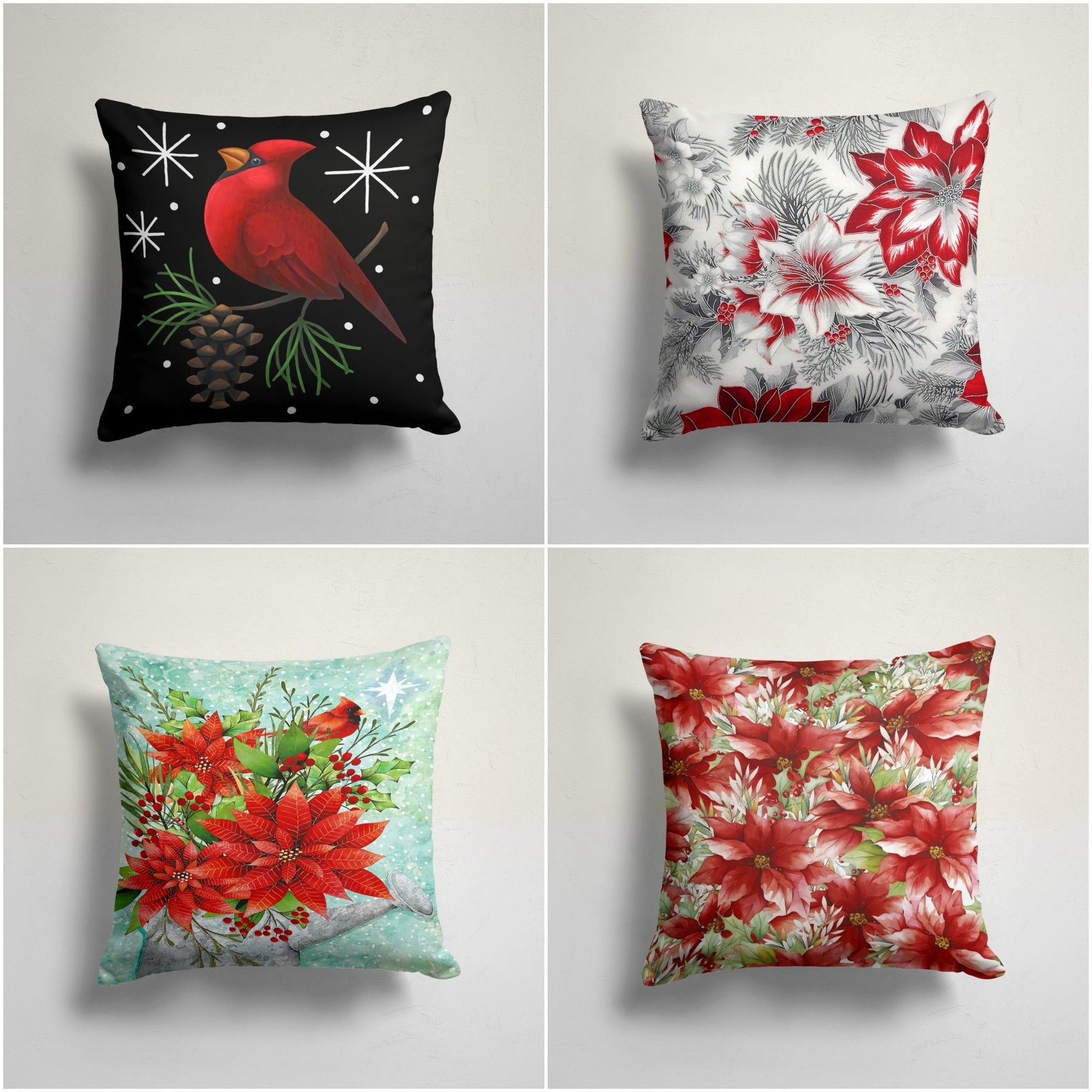 These elegant square decorative rustic farmhouse throw cushion covers with floral cardinal Xmas bird and red poinsettia flower;