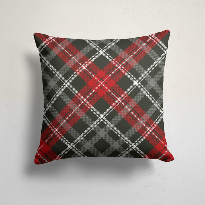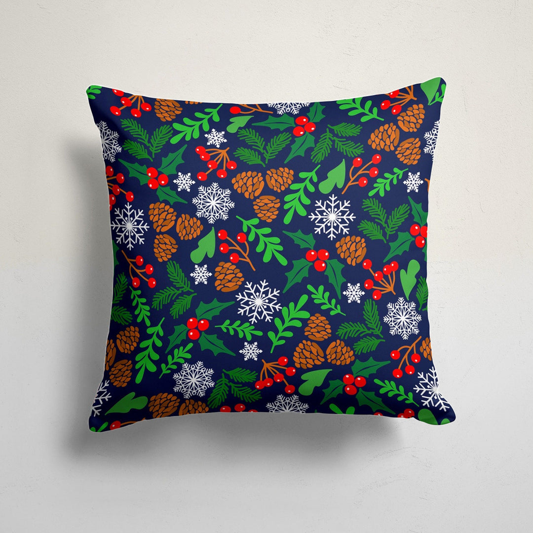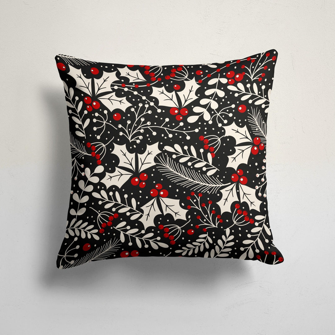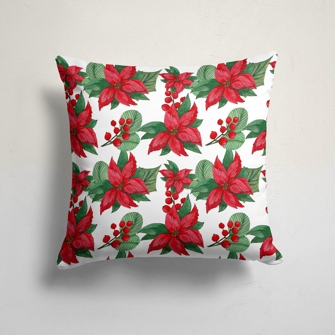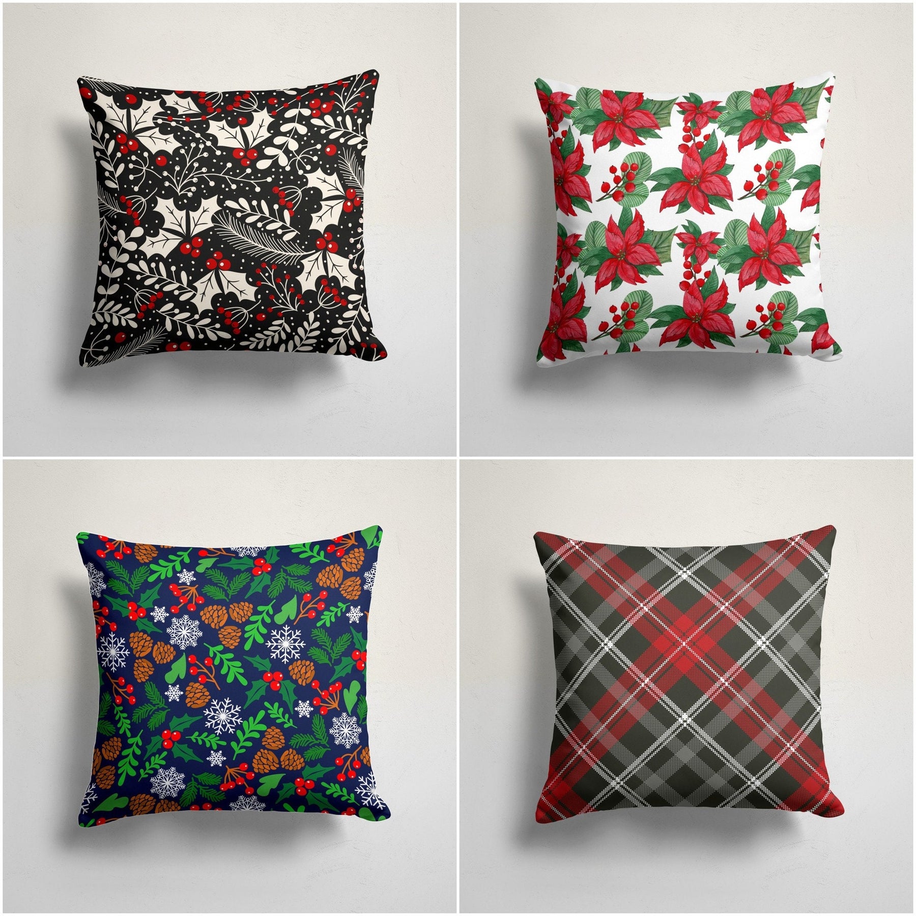 These elegant square decorative rustic farmhouse throw cushion covers with Red Berries, Red Poinsettia and Green Leaves, matching color plaid design;