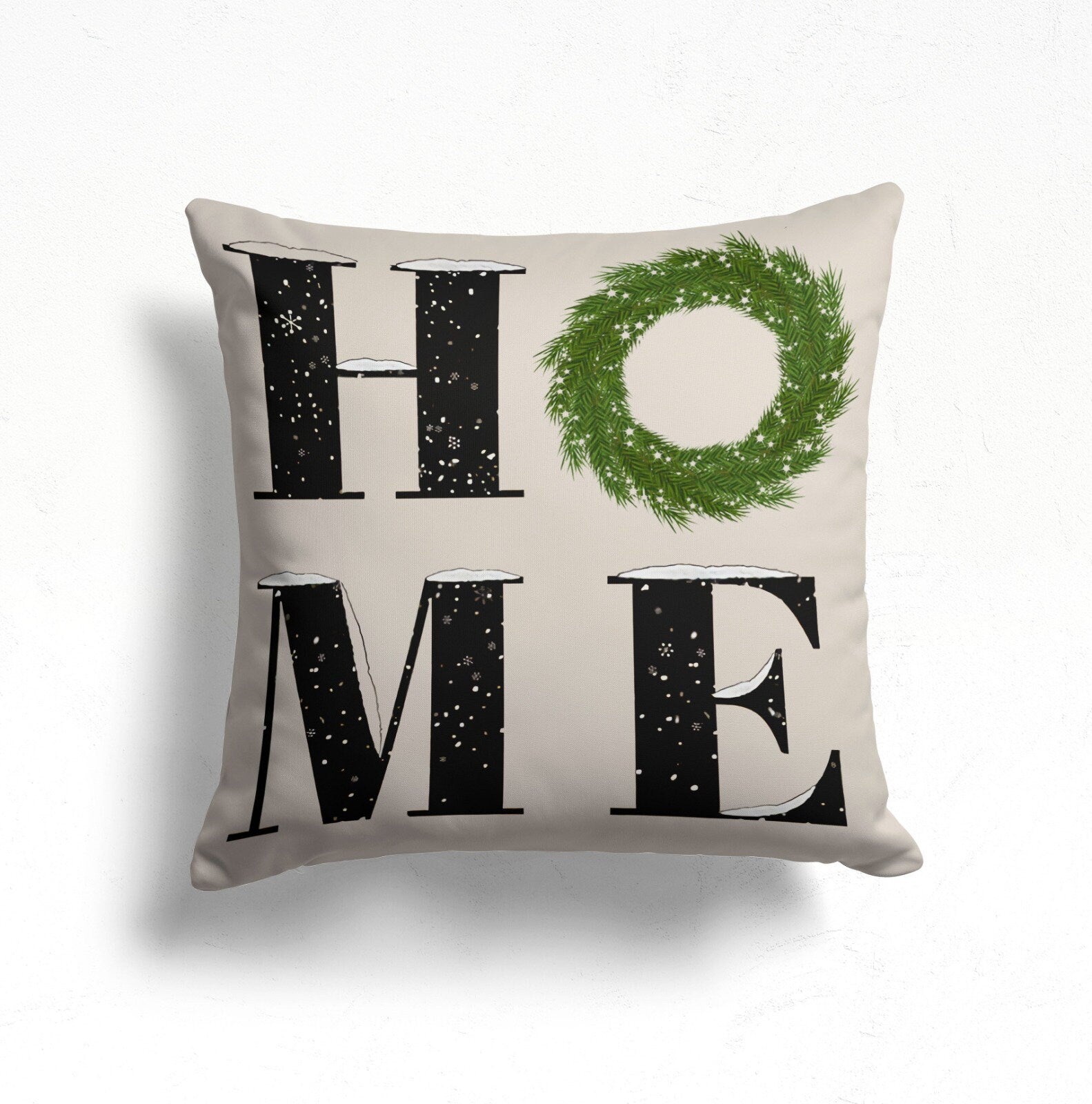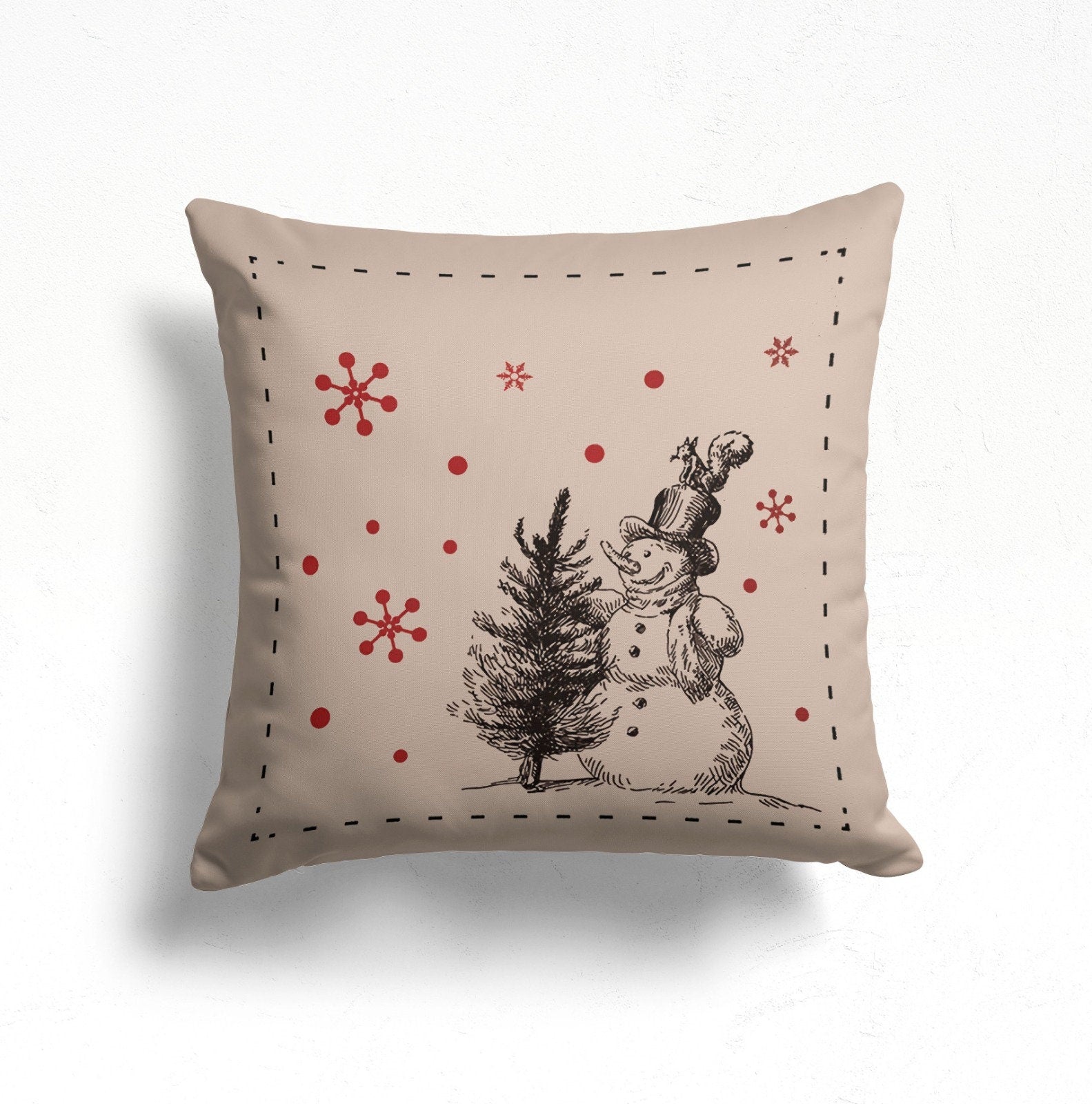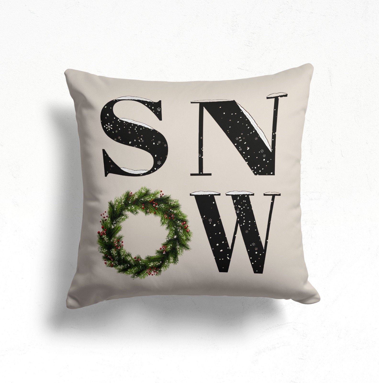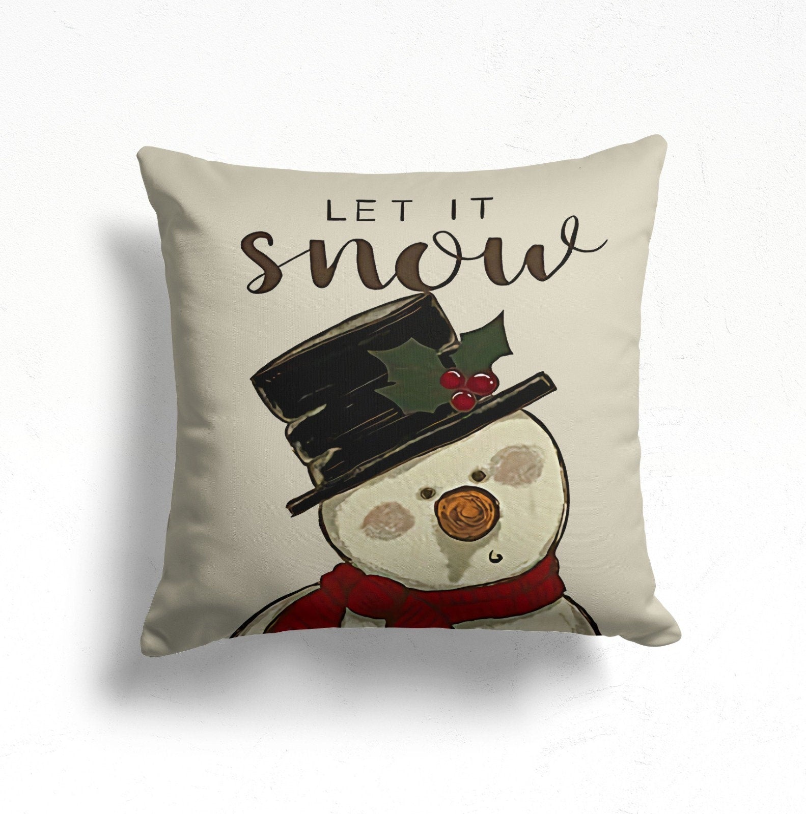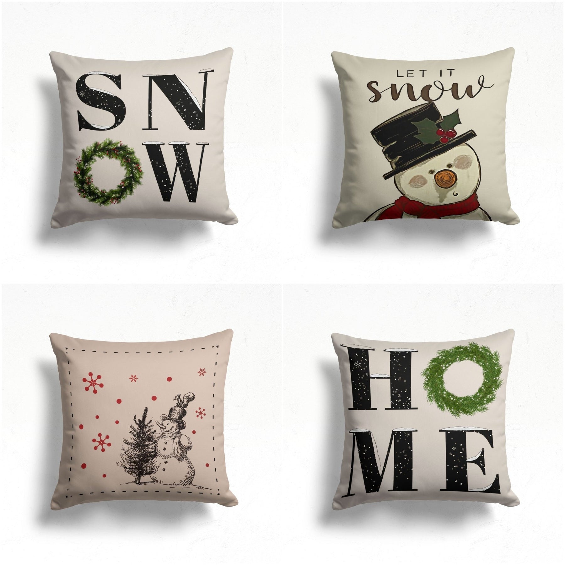 These elegant square decorative farmhouse style throw cushion covers with Snow/Home/Let It Snow prints, cute snowman with pine tree and red snowflake;