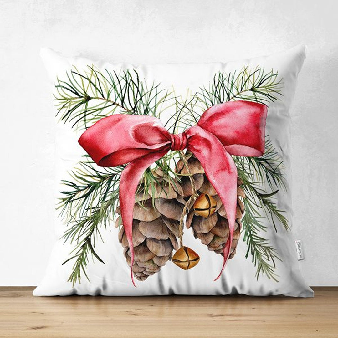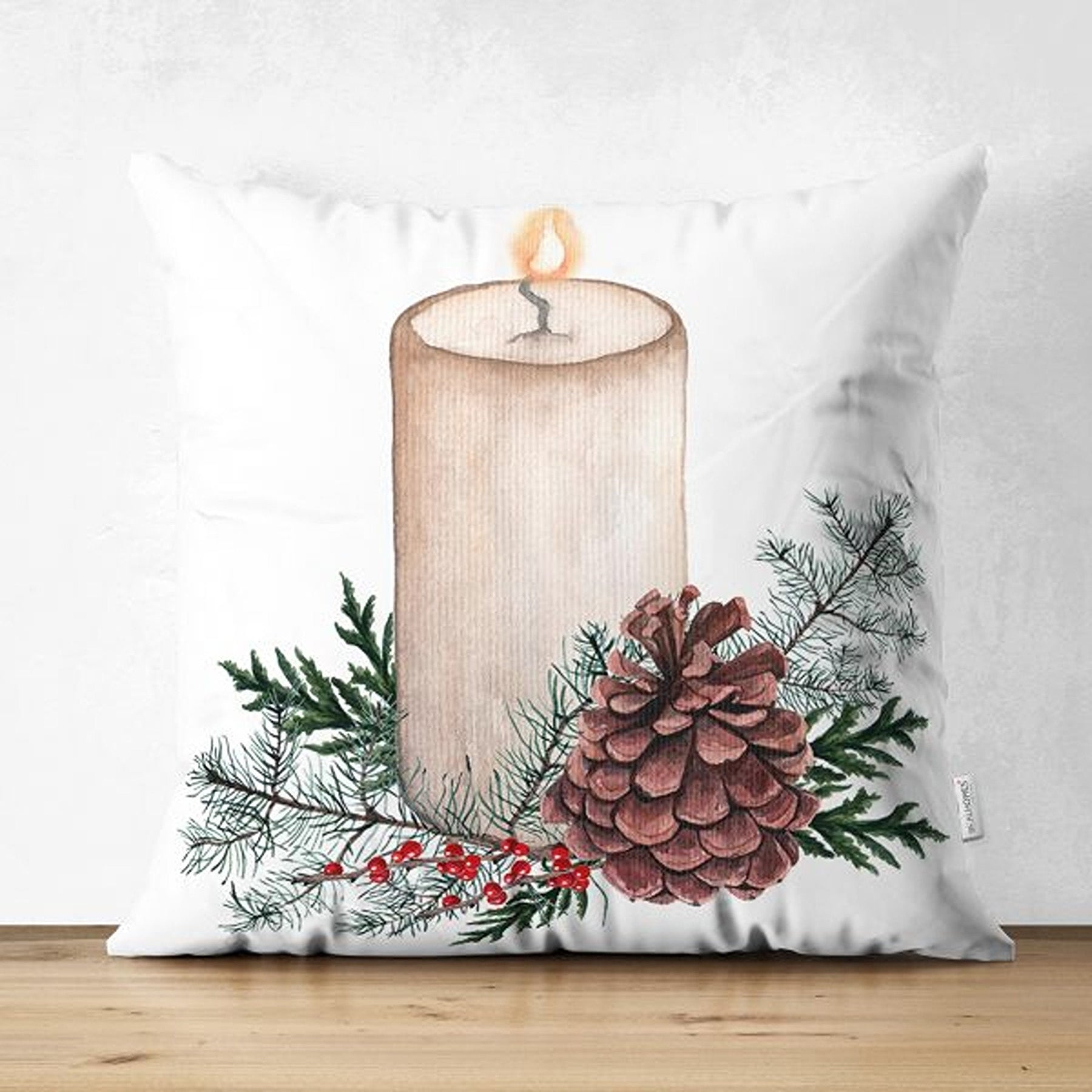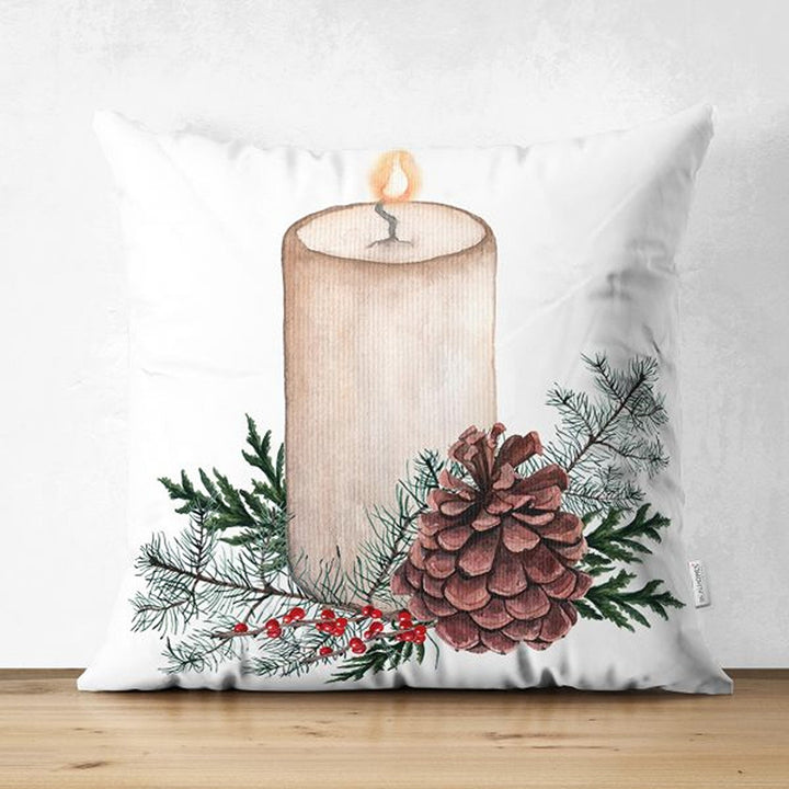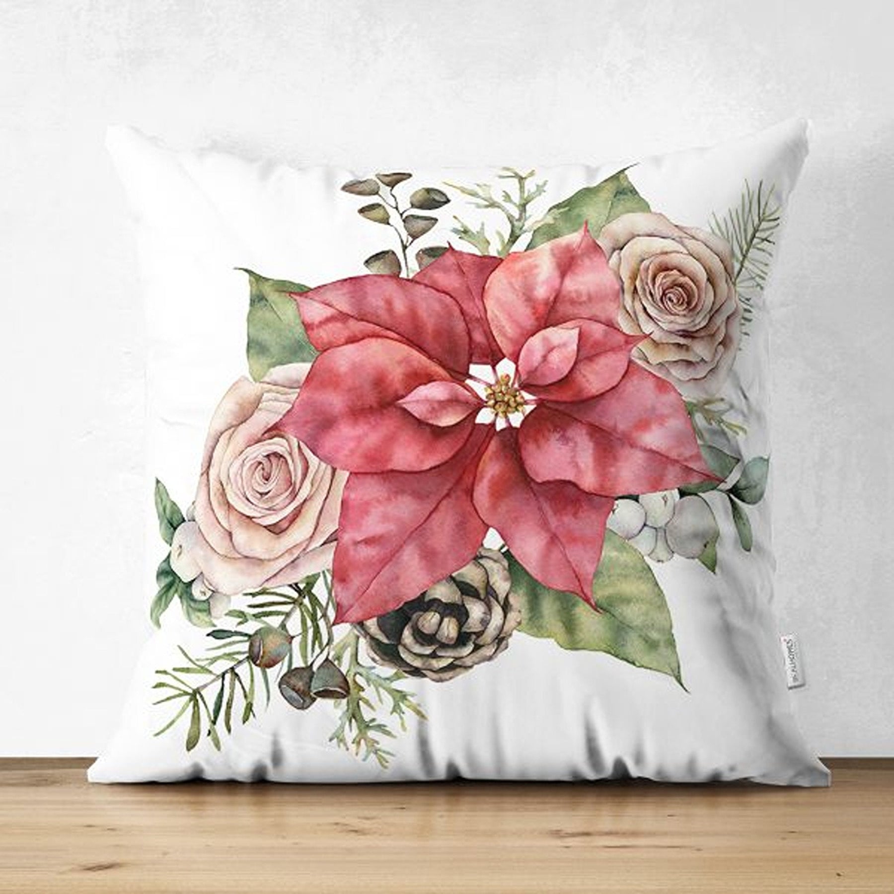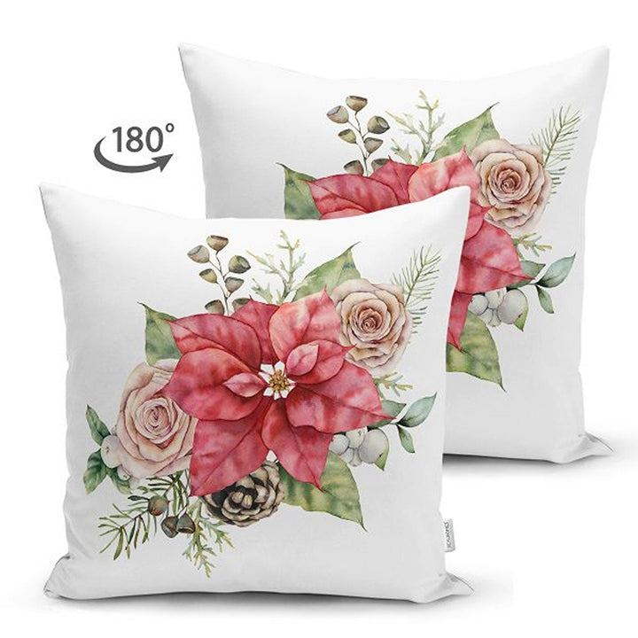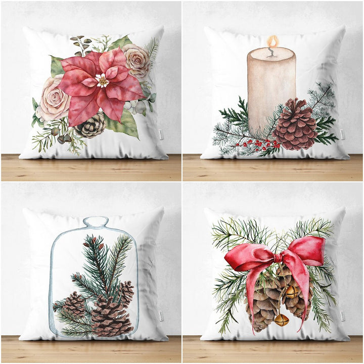 These elegant square decorative double-sided winter trend throw pillow covers with Red Poinsettia and White Rose, Red Ribbon with Pine Cone and Pine Tree Needles, Candle with Pine Cone;