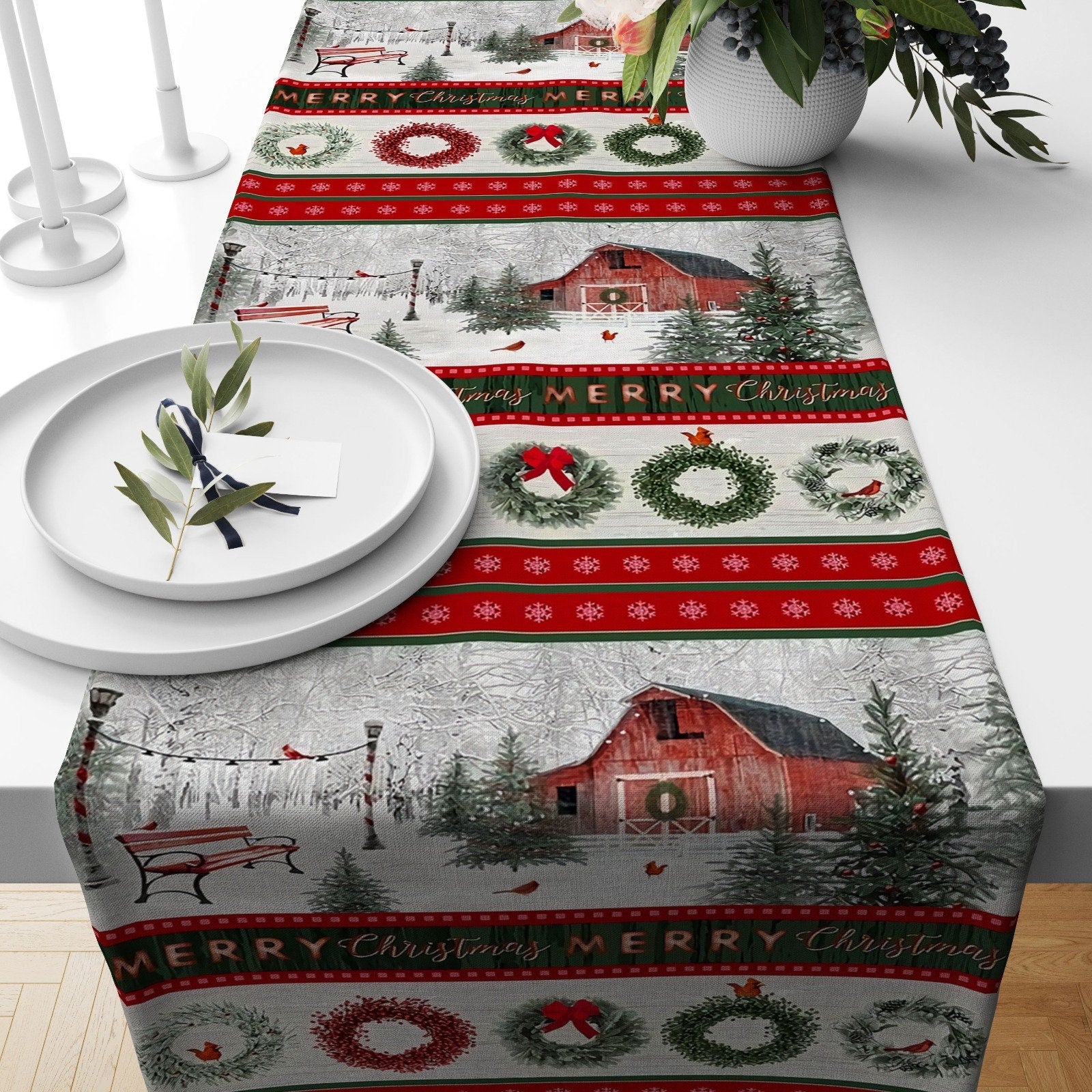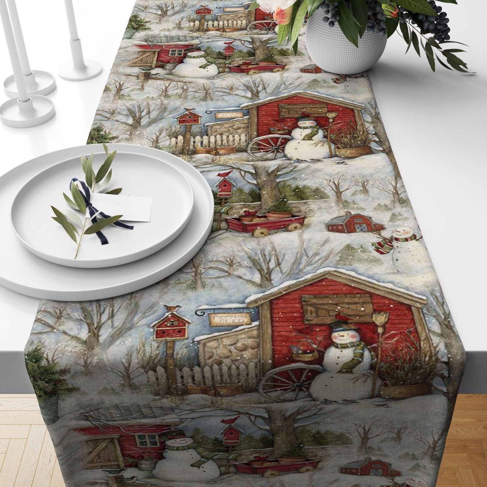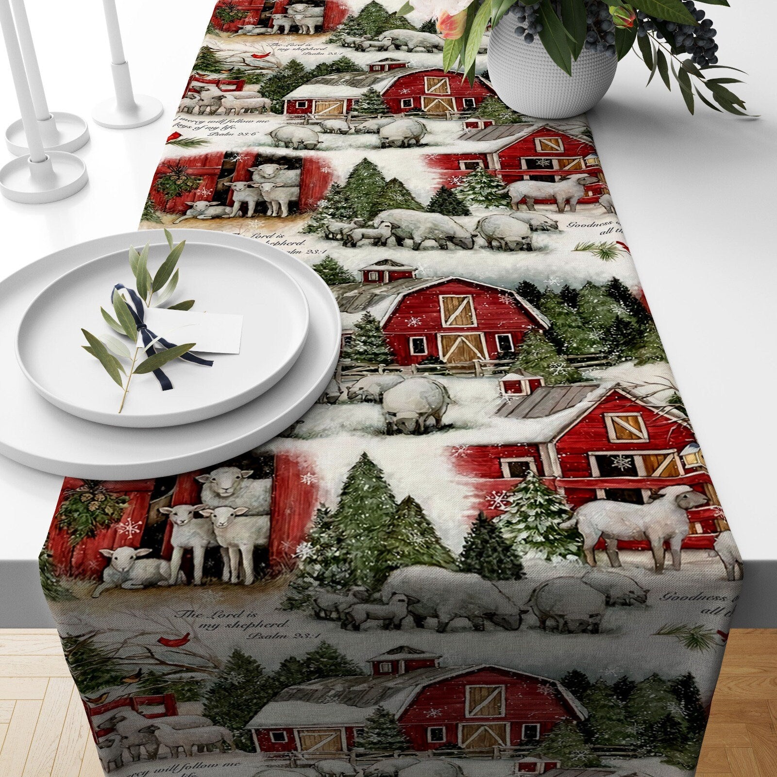 This high quality, natural, rustic farmhouse style table decor with snow, houses, trees, pine trees, snowman, sheep and Merry Christmas print;