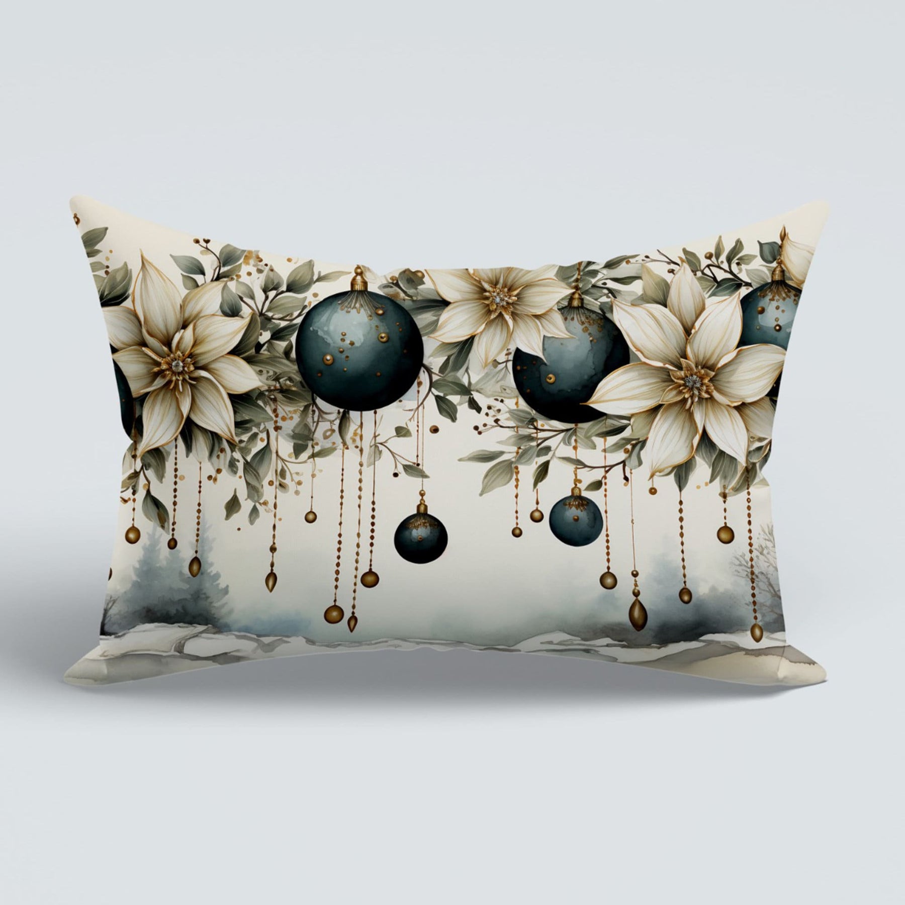 These decorative rectangle winter trend lumbar pillow covers with Xmas ornament, white poinsettia, winter, seasonal, Christmas theme prints;