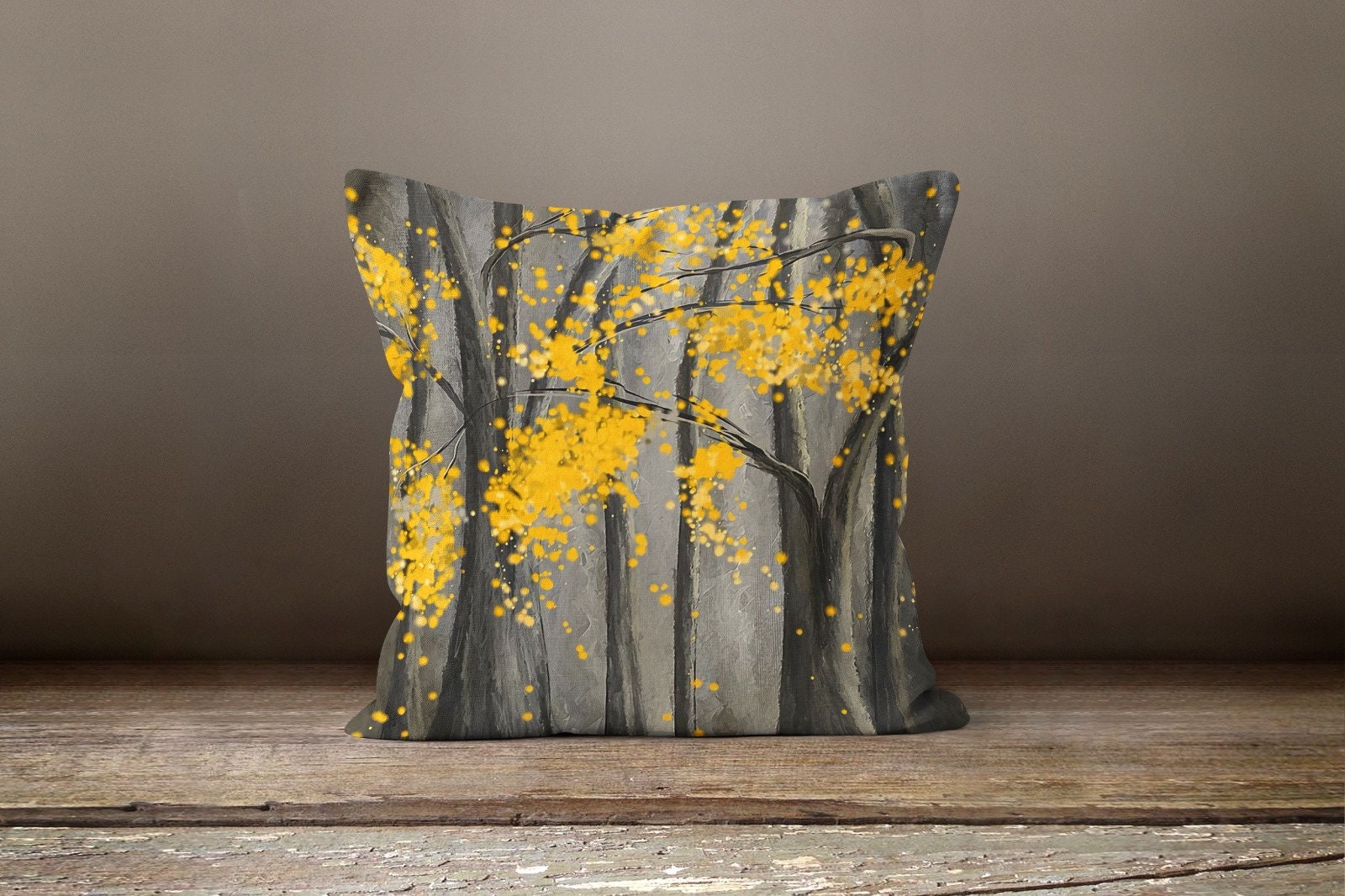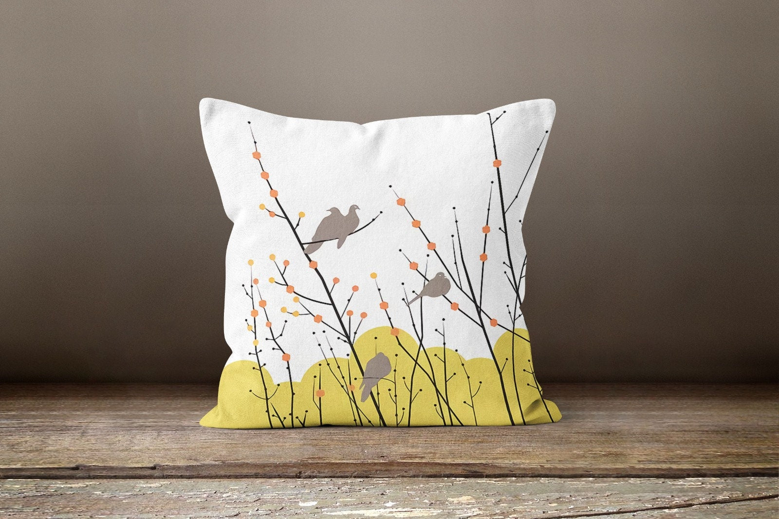 Yellow Floral Pillow Cover with Gray Bird on Tree